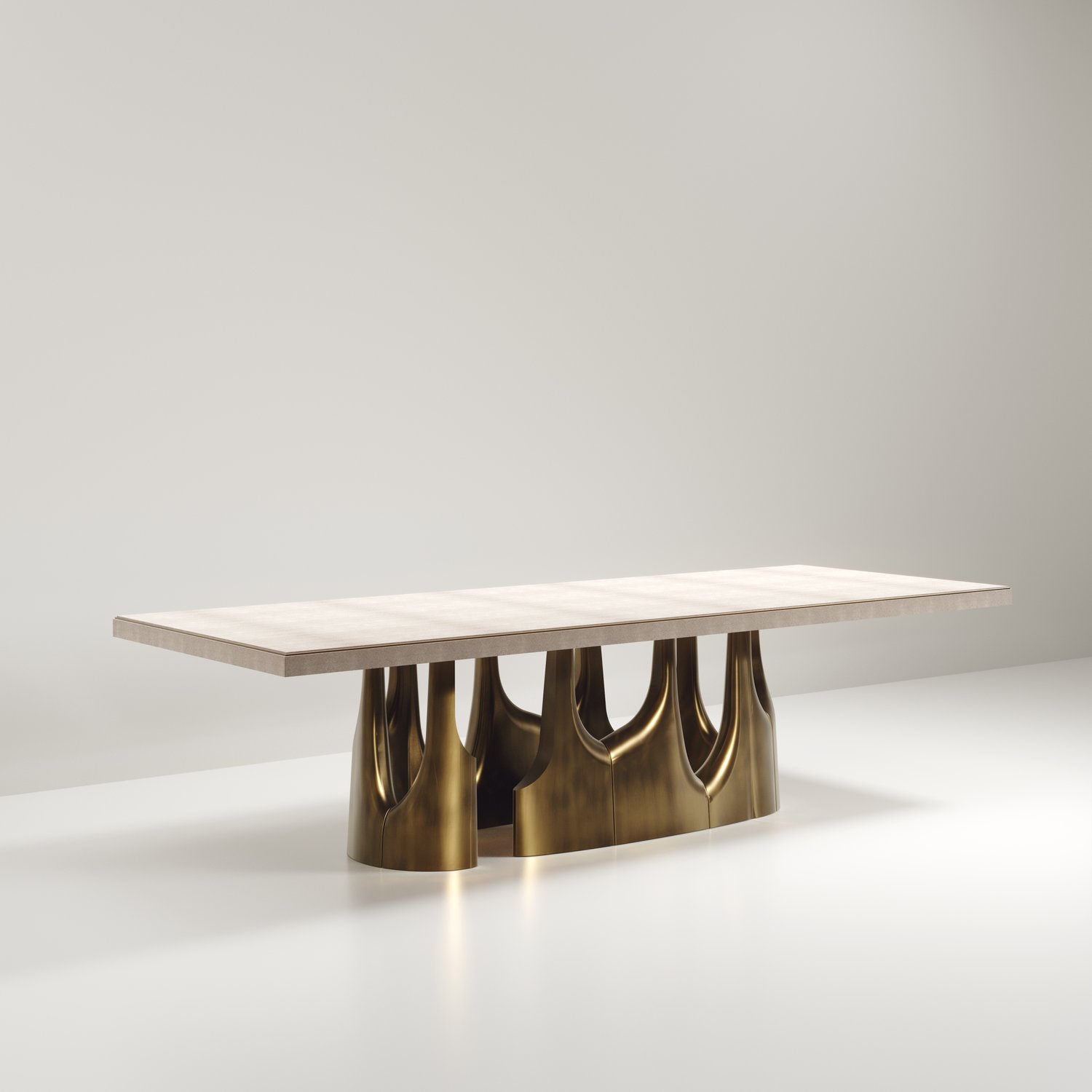 The Triptych II Dining Table by R&Y Augousti is a stunning multi-faceted sculptural piece. The beautiful hand craved details on the long clustered bronze-patina base demonstrate the incredible artisan work of Augousti. The top is in an incredible semi precious blue tiger eye stone. Available in other finishes and other variations.