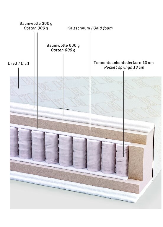 Ein Tonnentaschenfederkern bringt Punktelastizit?t. Insgesamt sechs Lagen Baumwolle in unterschiedlichen H?hen sorgen für ein wohliges und bauschiges Liegegefühl. Kaltschaum gibt der Matratze Stabilit?t und Elastizit?t und l?sst sie atmen. Kombiniert man die Sandmann Pocket 3 Matratze mit einer leichten Boxspringbasis, erreicht man mit kleinem Einsatz traumhaften Schlafkomfort.