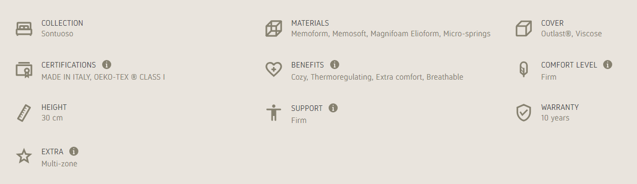Sontuoso Primo 12 embodies all the wealth of a handcrafted tradition and combines it with the high quality of the materials and the use of the most advanced manufacturing technologies. The art of knowing how to help people sleep in style is authenticated by the elegant signature design and provides a soft support in 30 cm of height.