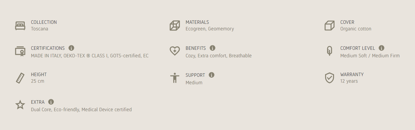Cotton Caresse Dual 10 of the Toscana collection is dedicated to those seeking relaxation while also being respectful of the environment. An all-natural comfort thanks to the materials used to manufacture this mattress for a medium support at 25 cm of height. The GOTS certification issued by the Institute for Ethical and Environmental Certification is proof that the fabrics used to manufacture this line are made of organic materials, in full respect for man and the environment.