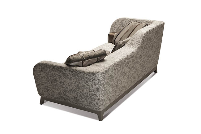 With its unique daybed shape, Jeremie recalls the Art Deco style, emphasized by its three variants: “Trendy”, turquoise fabric with special white details and orange base, “Fashion”, in shades of deep pink with floral patterns, striped details and green base, “Glamour”, in elegant taupe and brown colours. Featuring a seat in feather and high resilient polyurethane foam, feather backrest pillows and solid beech wood base in standard wenge finish or RAL color on demand, Jeremie is available in two widths, 214 cm and 228 cm and in several contemporary or classic fabrics. Jeremie is also available in bed version with a 190 cm long mattress.