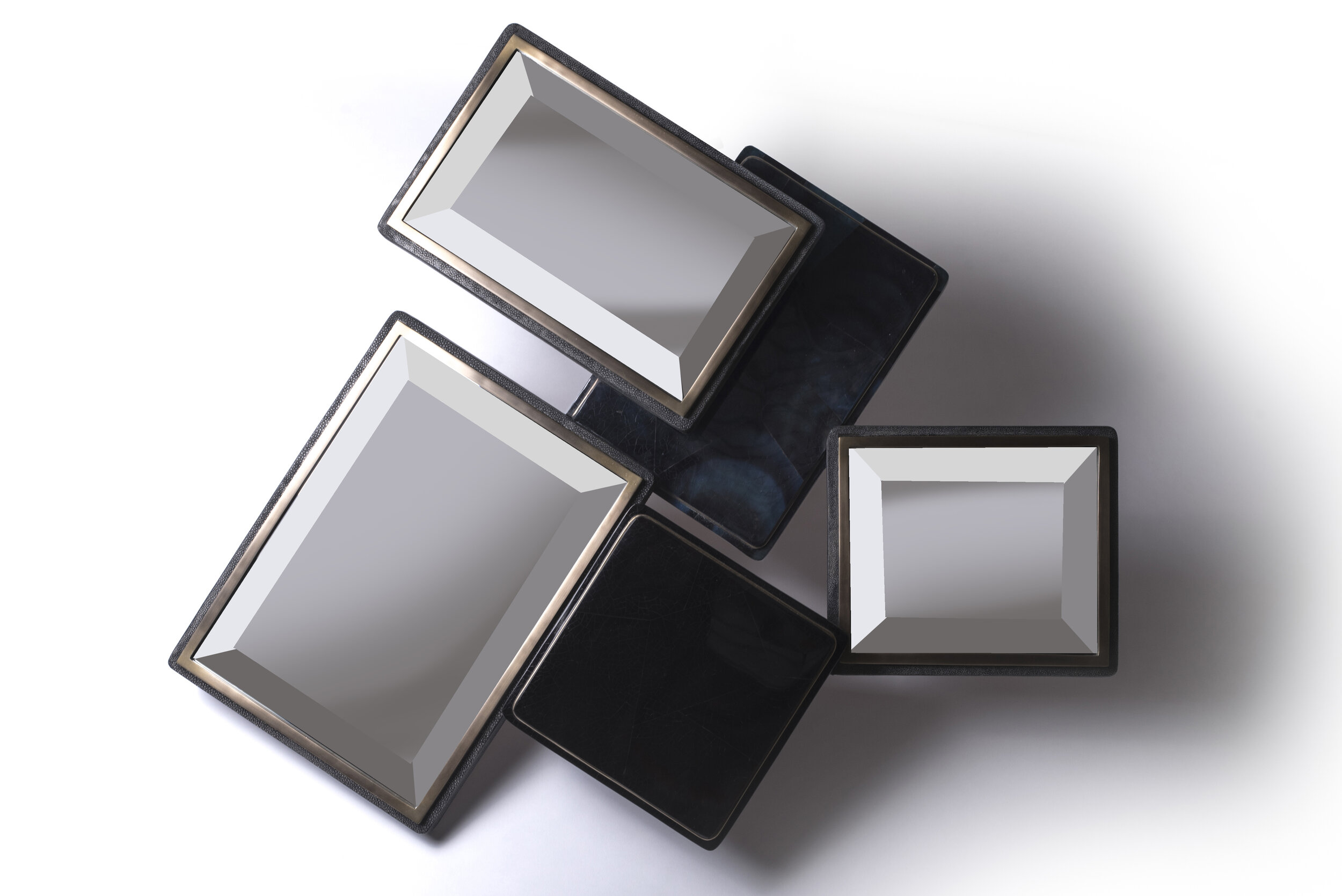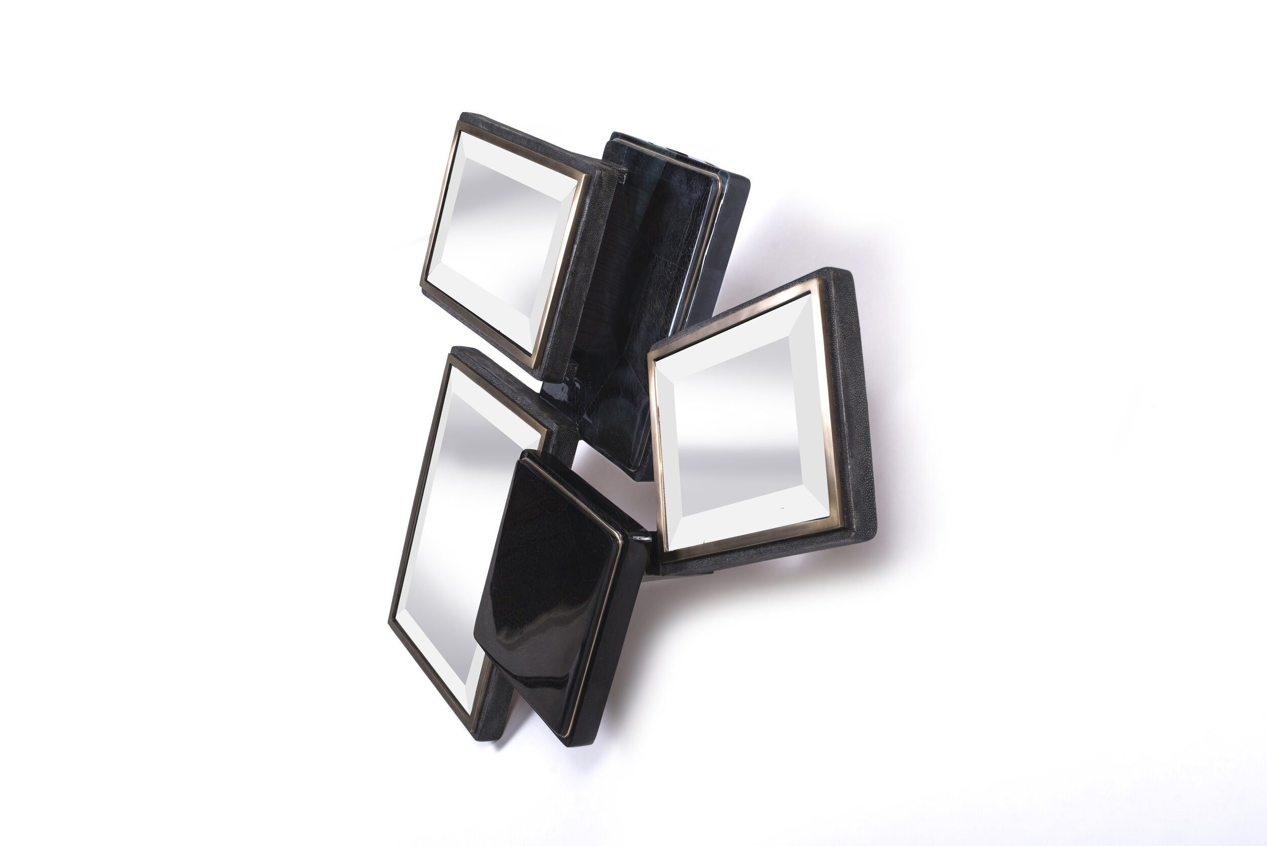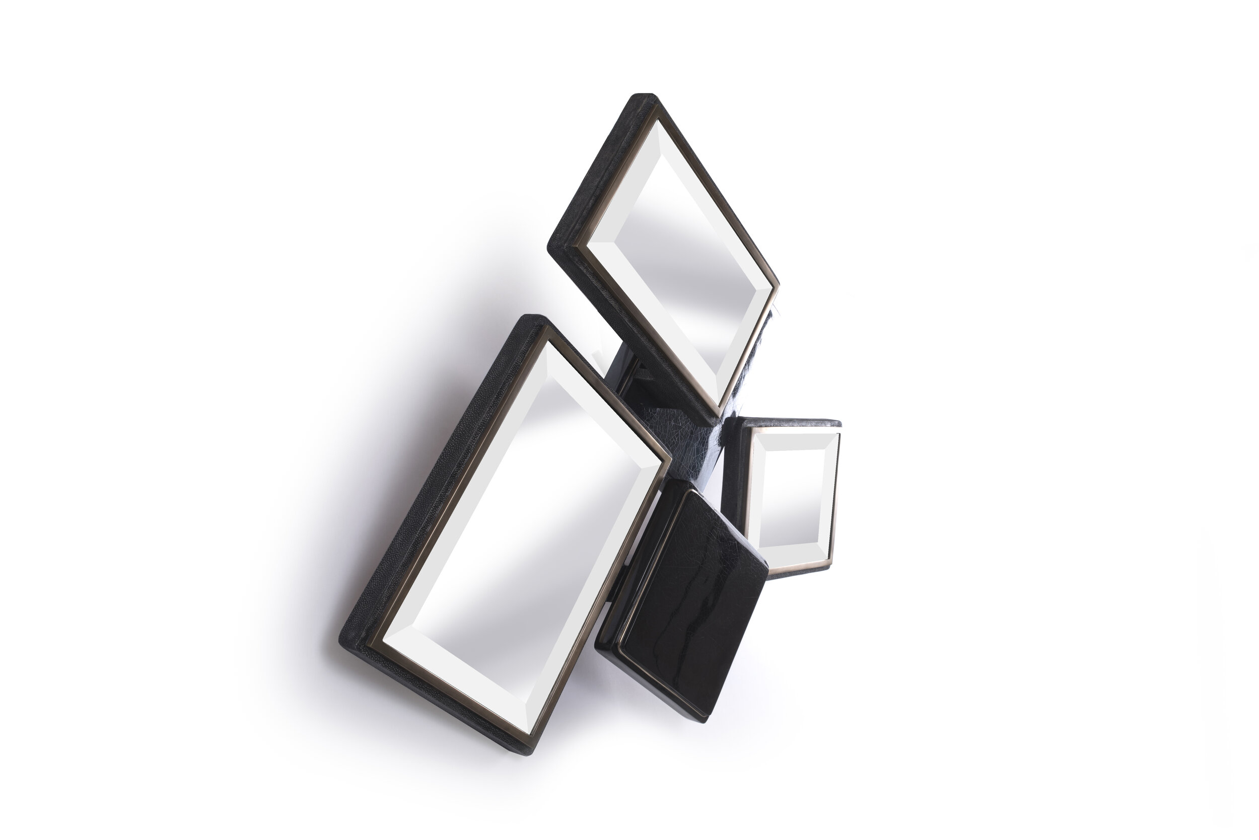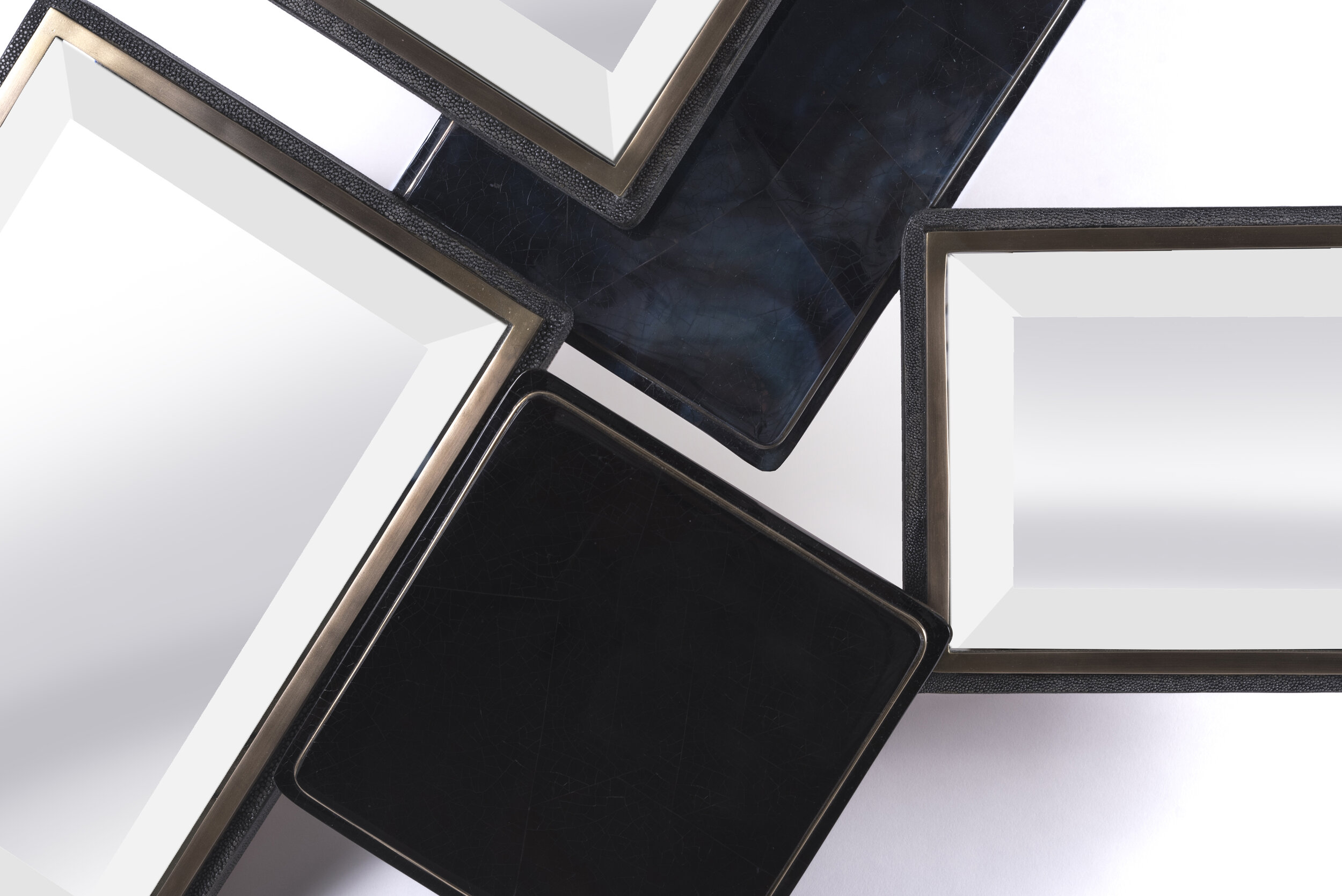 The Mondrian Mirror Medium is a playful graphic piece with its geometric mixture of mirror parts and black shagreen, black pen shell and blue pen shell parts that are placed on different levels. Each part has a discreet metal indentation detail adding another element of luxury to the piece. This mirror can be hung different ways to create a different expression each time. The shagreen is hand-dyed by artisans creating a one of a kind piece each time.
