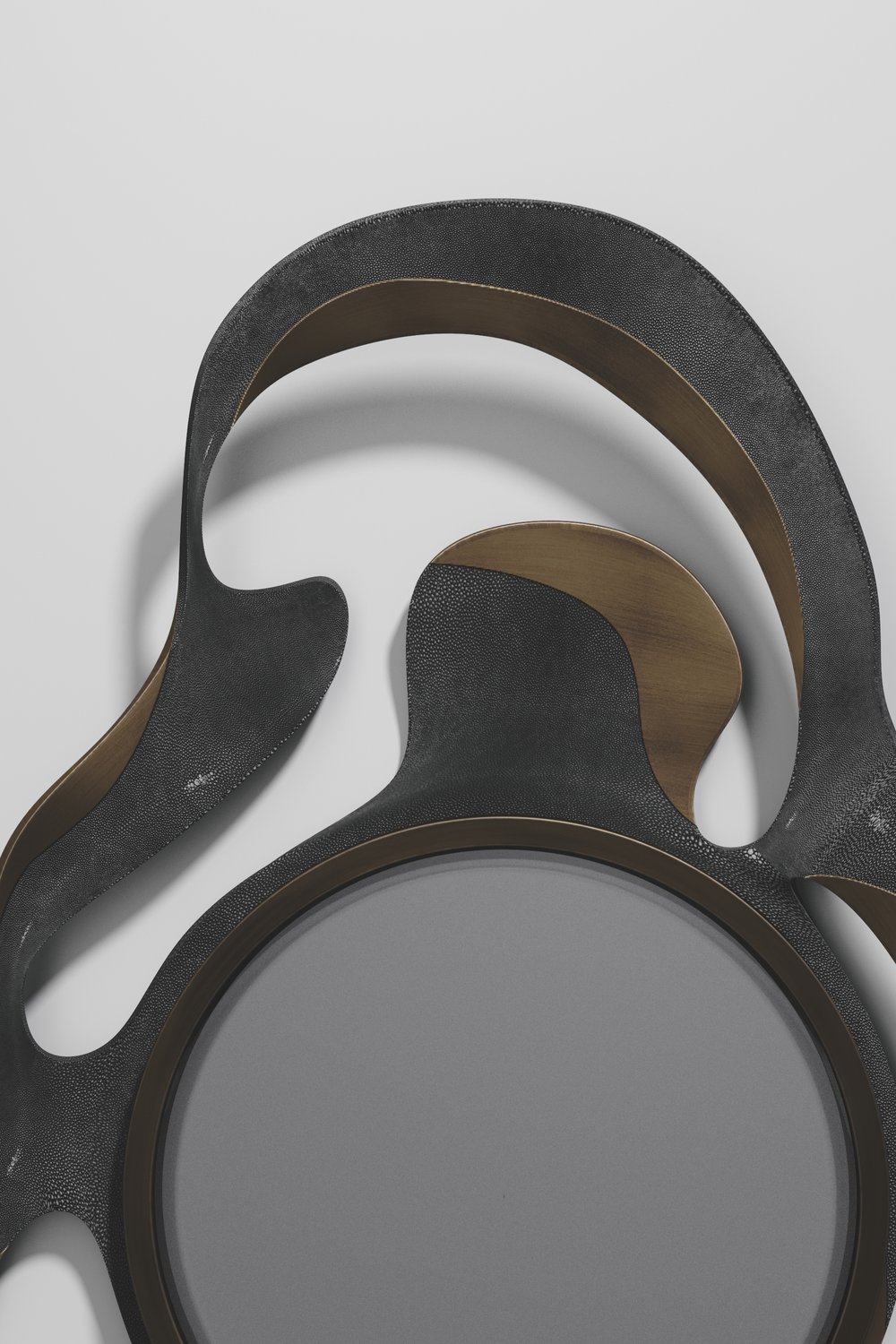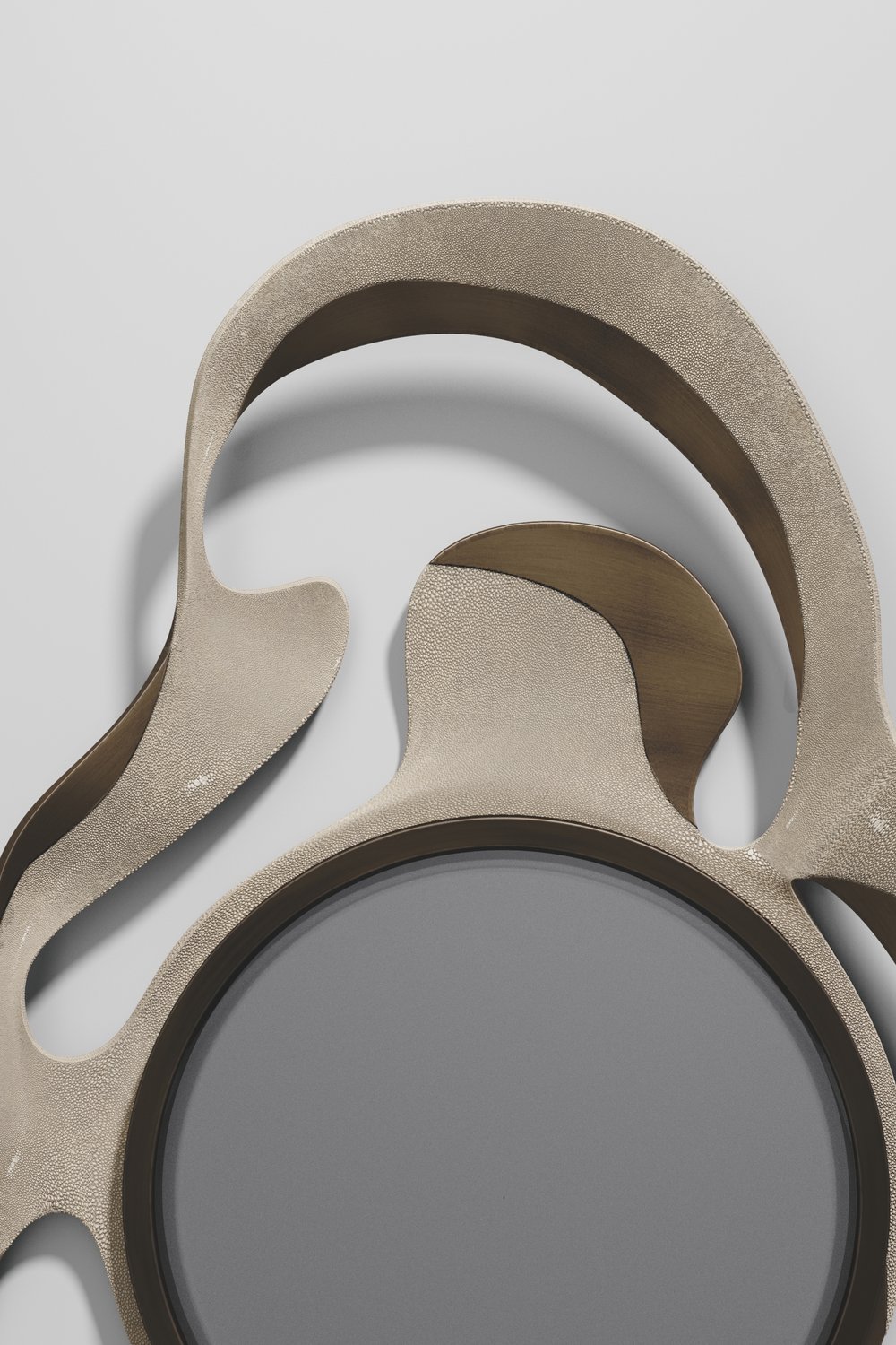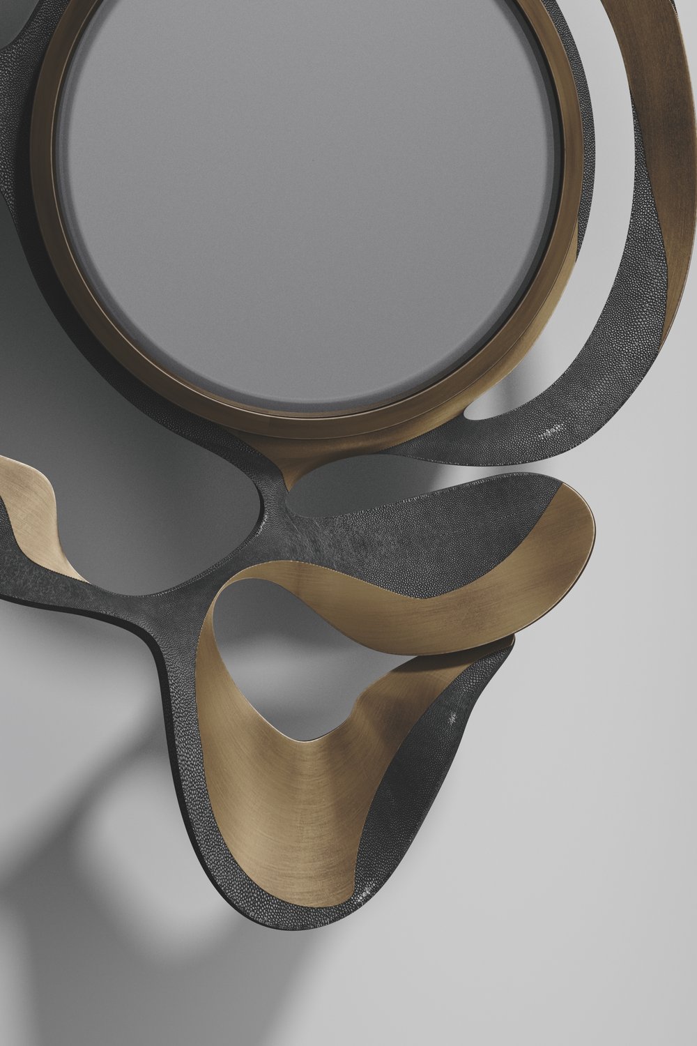 The Leaf Mirror by Kifu Paris is a dramatic and organic piece. The shagreen or shell with bronze-patina bass inlay mixture creates a striking appearance as it emulates a whimsical interpretation of intertwining branches. This piece is designed by Kifu Augousti the daughter of Ria and Yiouri Augousti.