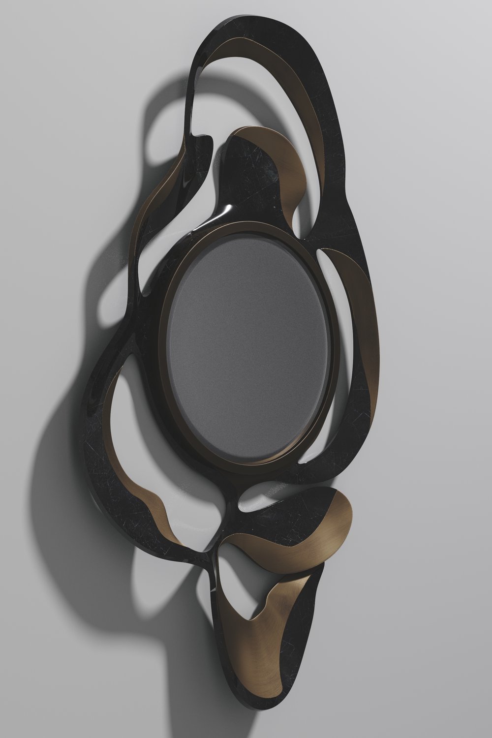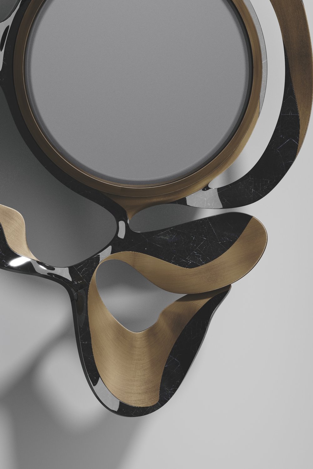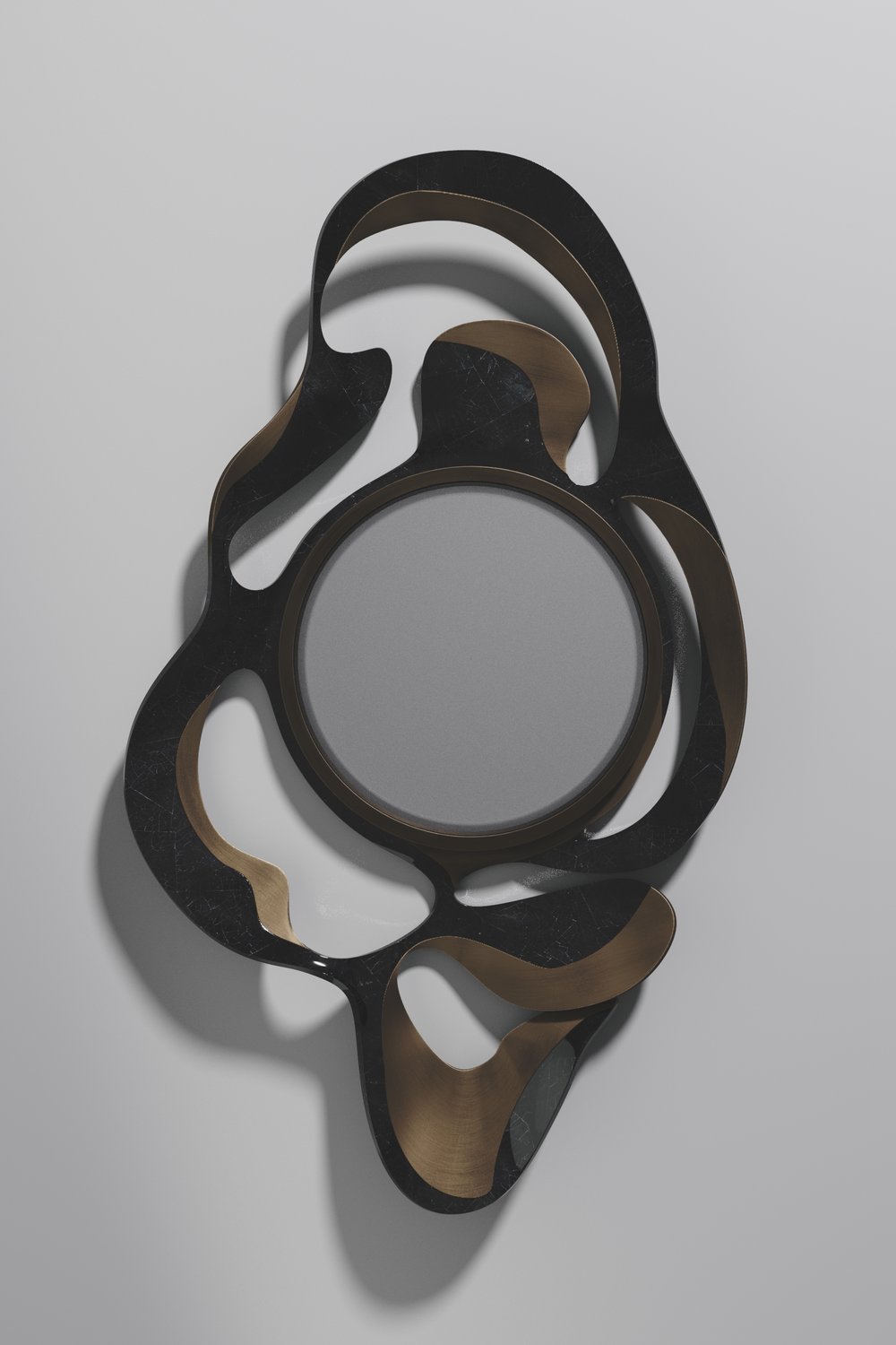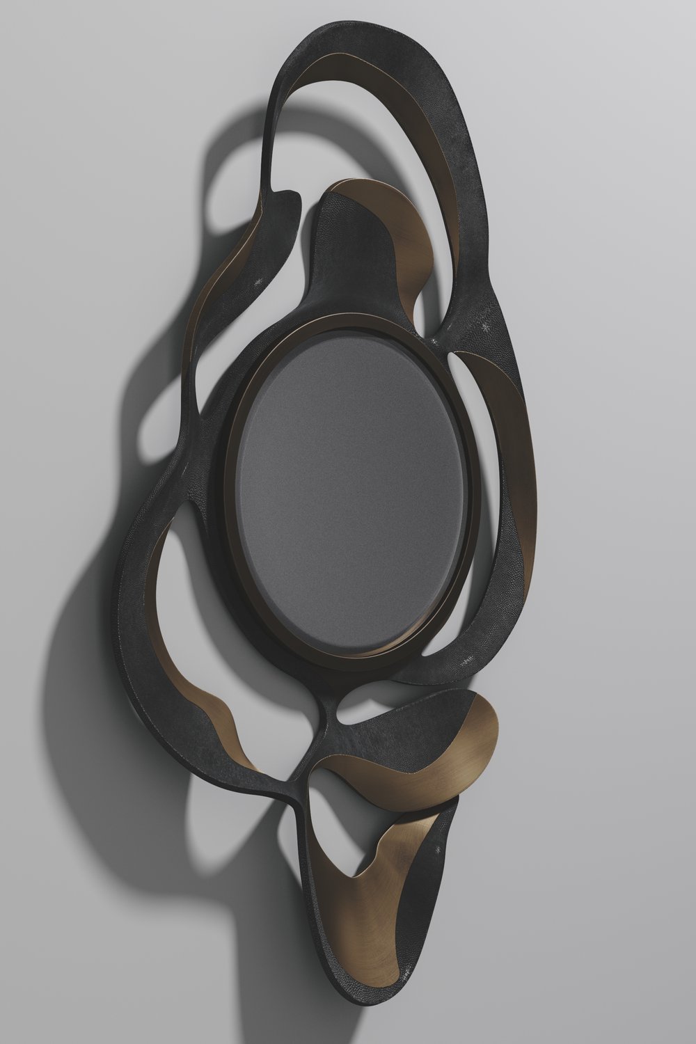The Leaf Mirror by Kifu Paris is a dramatic and organic piece. The shagreen or shell with bronze-patina bass inlay mixture creates a striking appearance as it emulates a whimsical interpretation of intertwining branches. This piece is designed by Kifu Augousti the daughter of Ria and Yiouri Augousti.