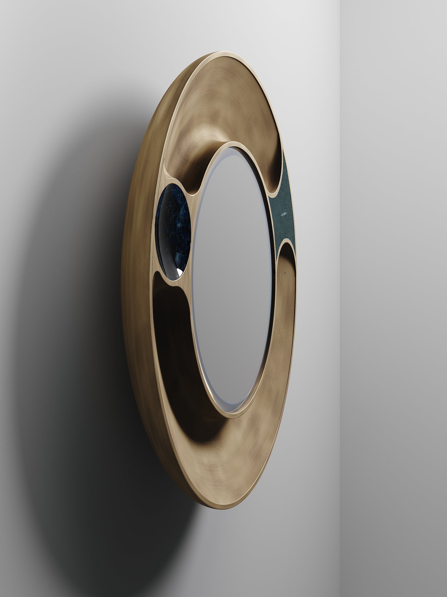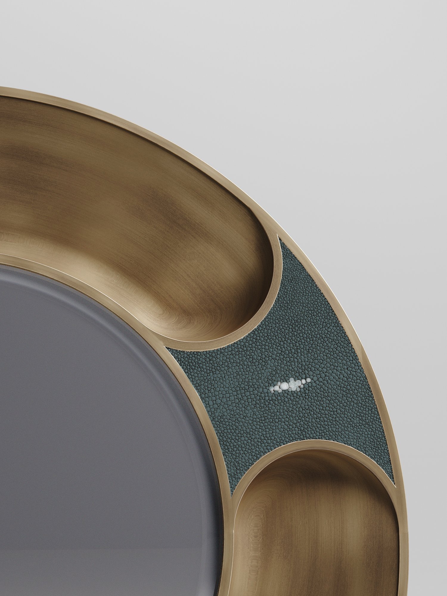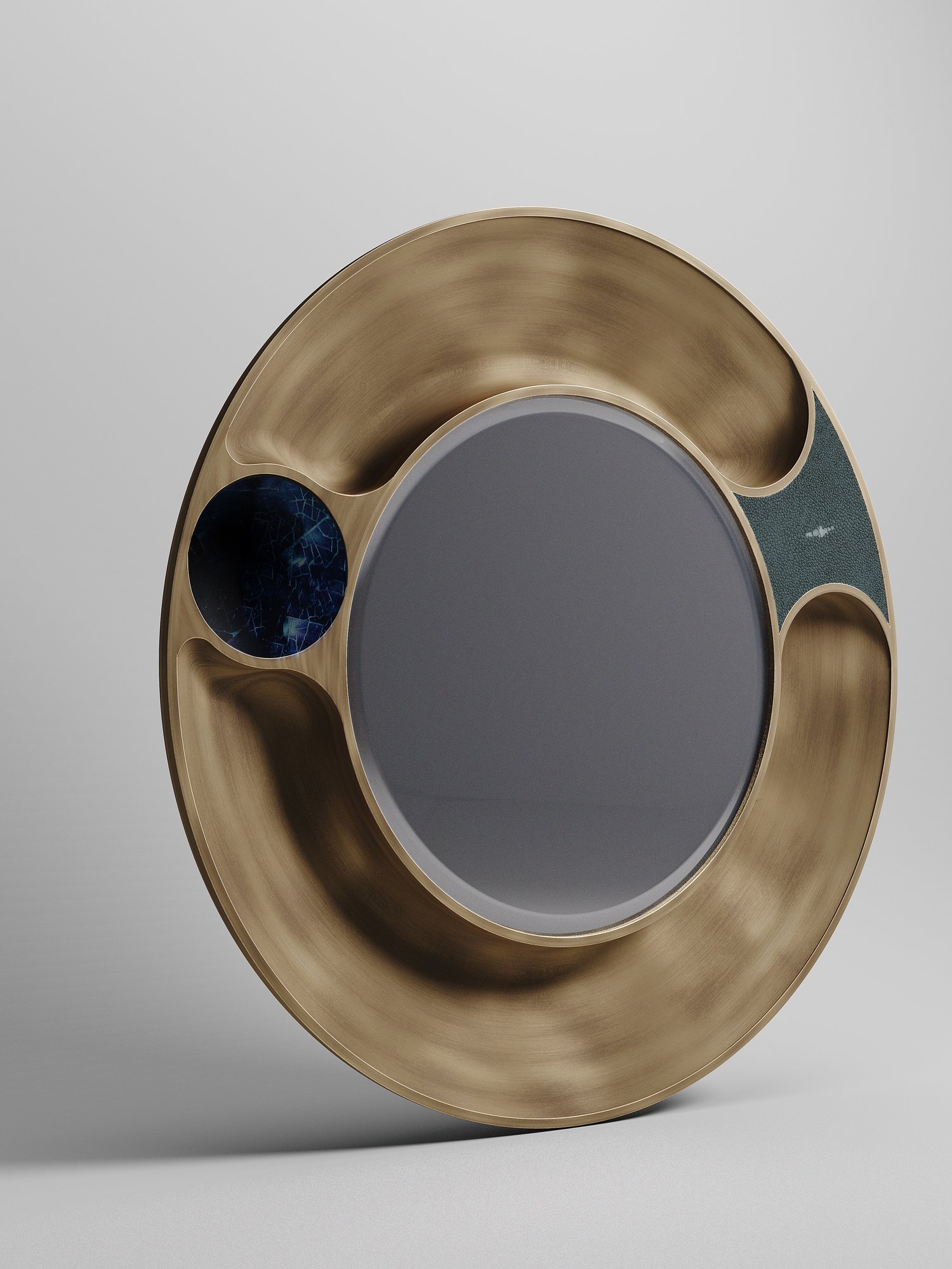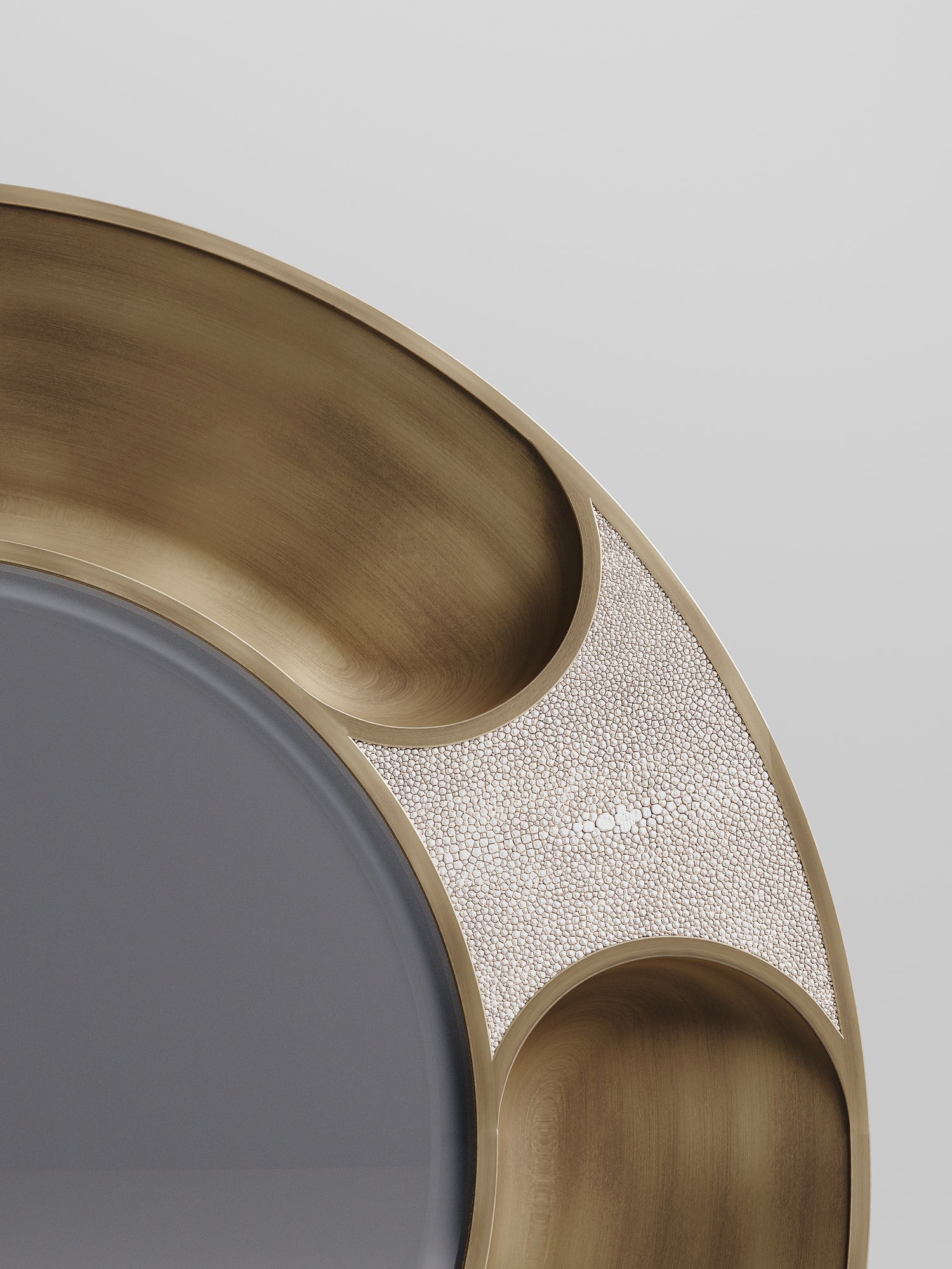 The Iris mirror by R&Y Augousti is an elegant and versatile piece. An abstract interpretation of an eye, the piece is inlaid in a mixture of shagreen, pen shell and bronze patina brass. Custom color and sizing available on request.
