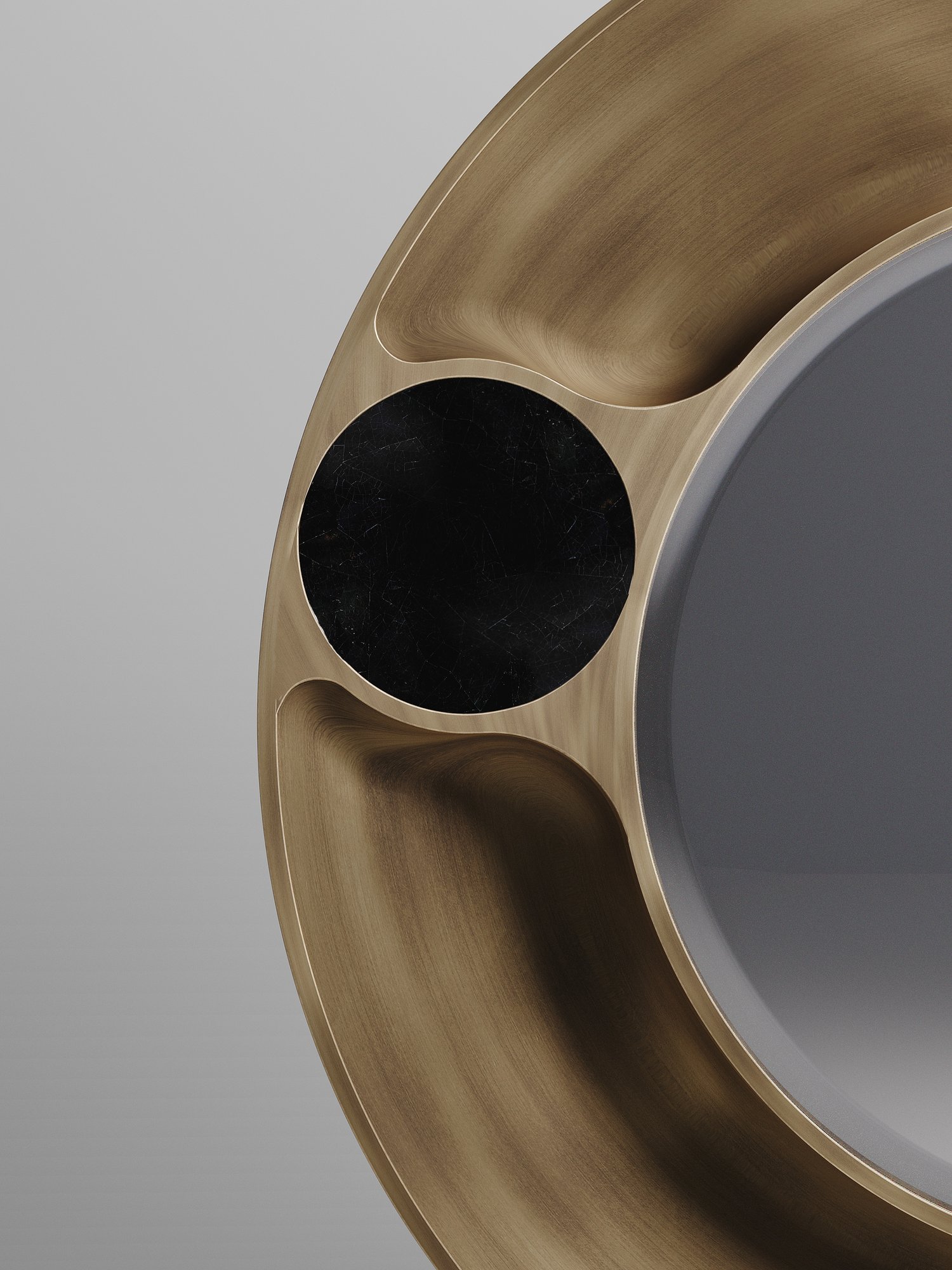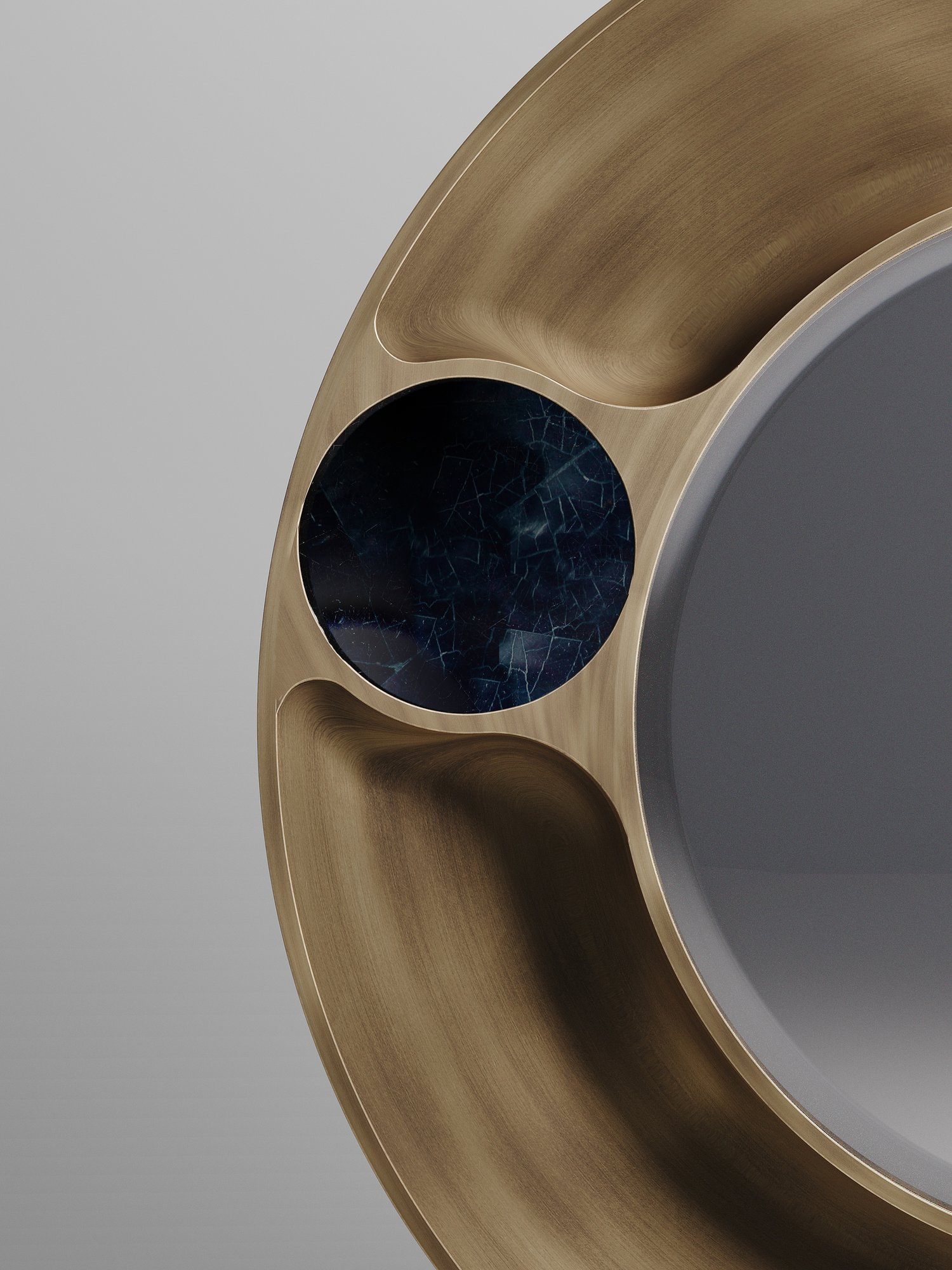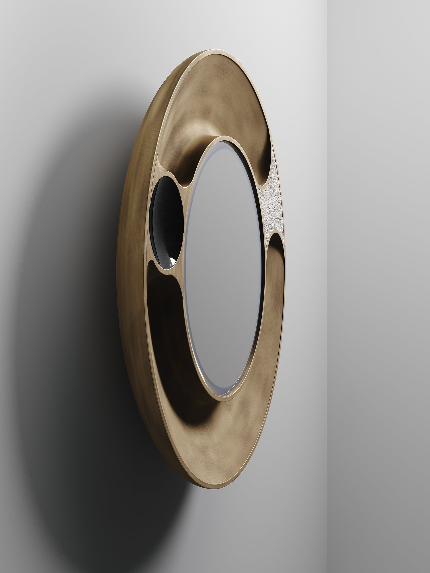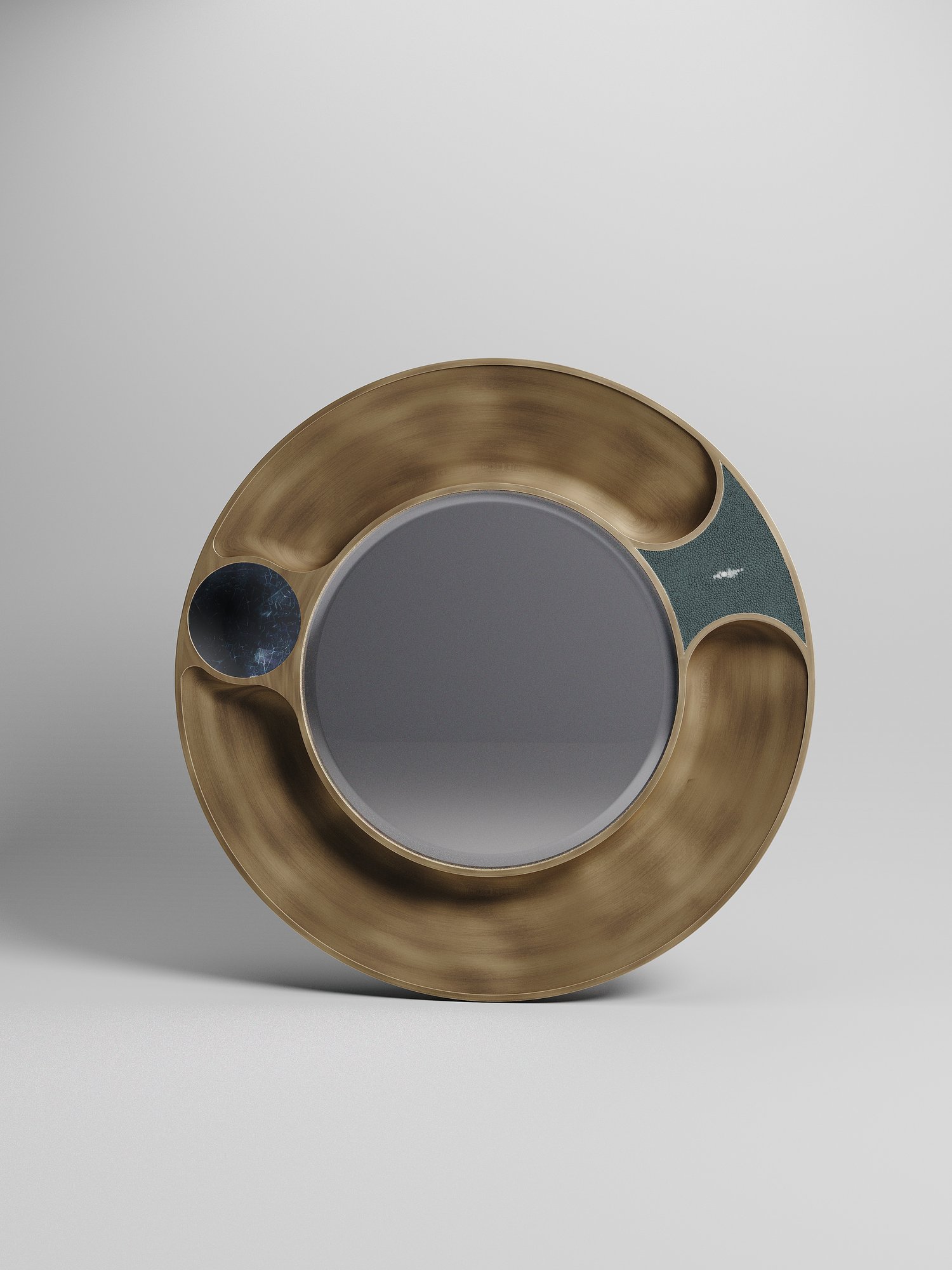 The Iris mirror by R&Y Augousti is an elegant and versatile piece. An abstract interpretation of an eye, the piece is inlaid in a mixture of shagreen, pen shell and bronze patina brass. Custom color and sizing available on request.