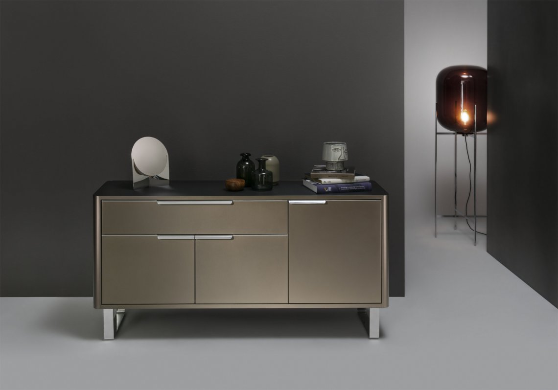 Das Design der NEW CLASSIC LINE setzt ein weiteres klares Statement wie sein ursprüngliches Pendant. Dabei kombinieren die M?belstücke eine harmonisch weiche Formensprache mit einer feinen vertikalen Linienführung. Modern interpretierter Glamour mit stilvollen Akzenten: Die hochwertige Verarbeitung der Jubil?umslinie gl?nzt mit edlen Materialien, luxuri?sen Details und warmen Bronzefarbt?nen. Diese Kombination verleiht eine exklusive Eleganz und bringt Ihr Zuhause optisch zum Strahlen.