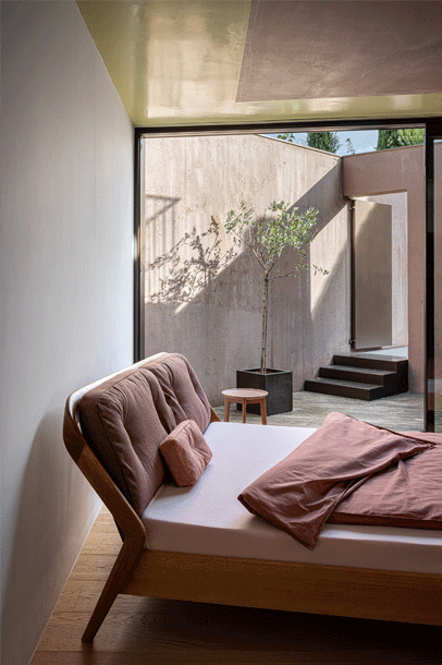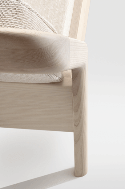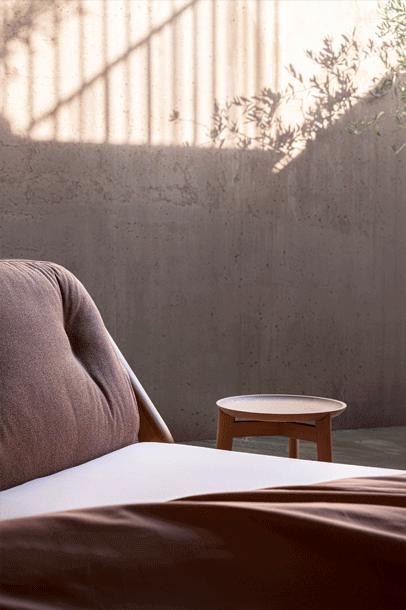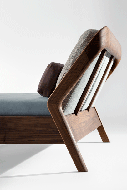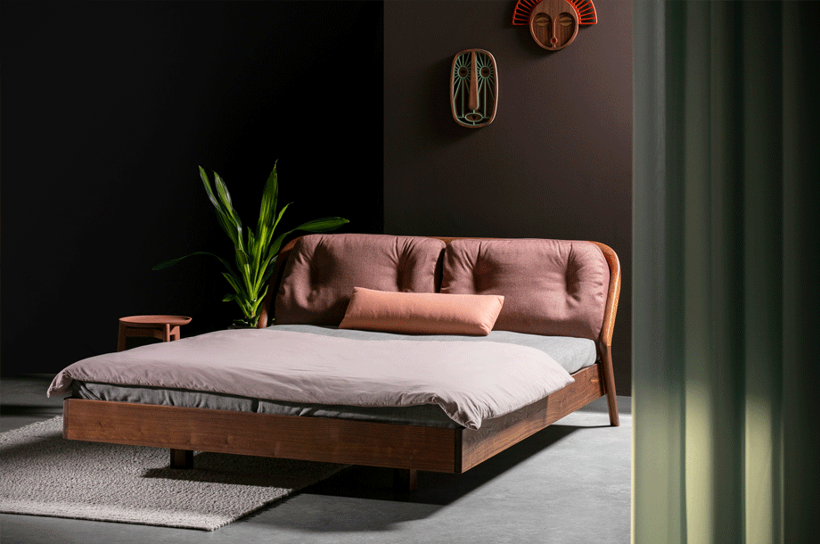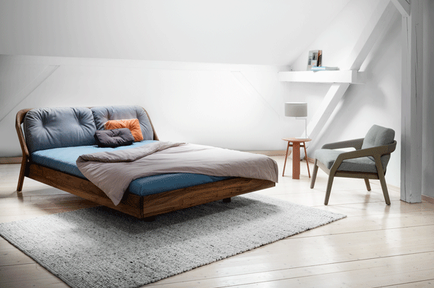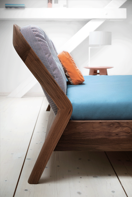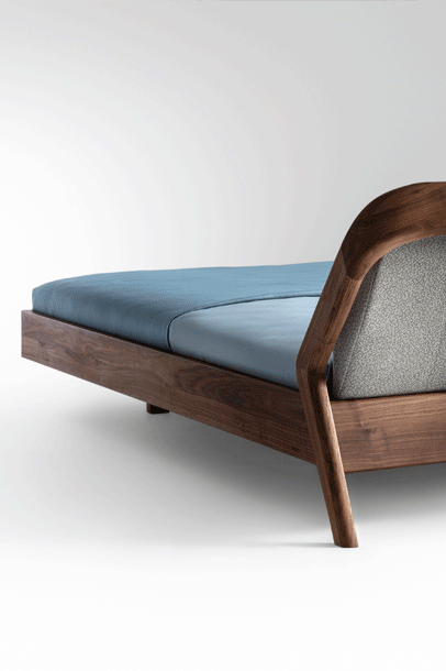 The backrest swings in a gentle arc from the headboard down to the ground. Midway, the elegance of the shape changes – it makes an unforeseen bend and the graceful back becomes a solid foot of the bed. The whole back looks like one piece and despite its solidity, it radiates a casual rest. In contrary, the front part of the bed seems to float in the air, due to the inwardly offset feet.