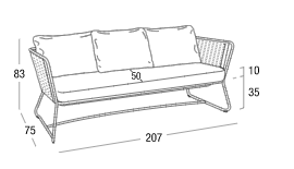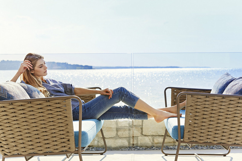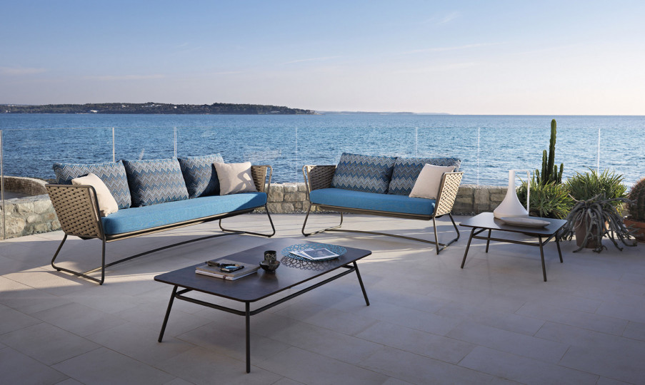 Divano in acciaio 304 verniciato a polveri, intrecciato con Flat Trendyrope. Un divano accogliente, dove la particolare geometria dello schienale si coniuga perfettamente al desiderio di comfort, creando un angolo per vivere momenti di relax. Ottimo per arredare terrazzi e patio, dona forte personalità anche alle zone living interne. Ideale per arredamenti residenziali e contract.
