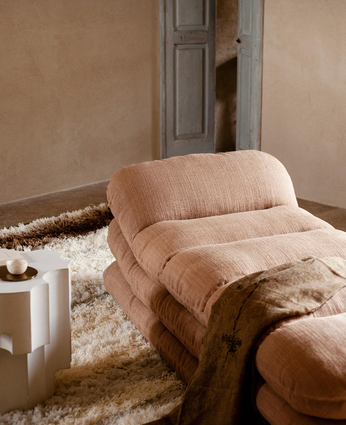 Calm and sophisticated manifesto of contemporary style, Solar sits at the heart of Toogood’s Cosmic collection. An upholstered sofa that at first glance appears as a stack of cushions. With its unmistakable blend of ingenuity and style, Faye Toogood invites relaxation upon these quilted piles. Solar merges sculptural forms and softness, offering a fresh interpretation of Tacchini’s iconic upholstery. The fabric intentionally crinkles, giving the seating a generous push. Solar boasts a relaxed aesthetic embodying the casual elegance of Faye Toogood’s studio. Its soft tactility sets it apart among Tacchini’s range of bold and captivating furniture.
