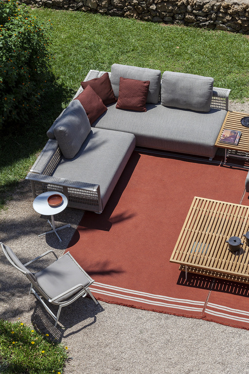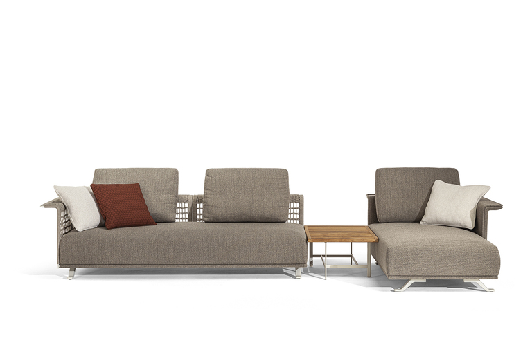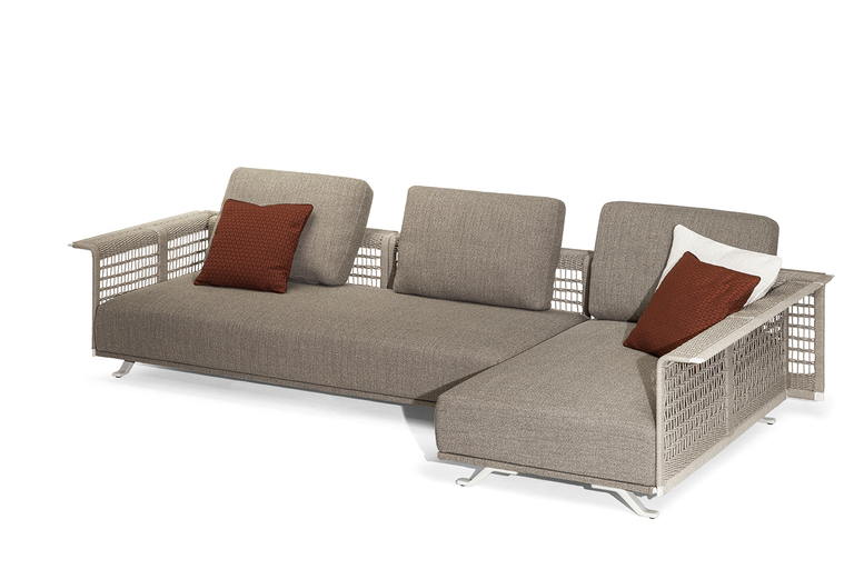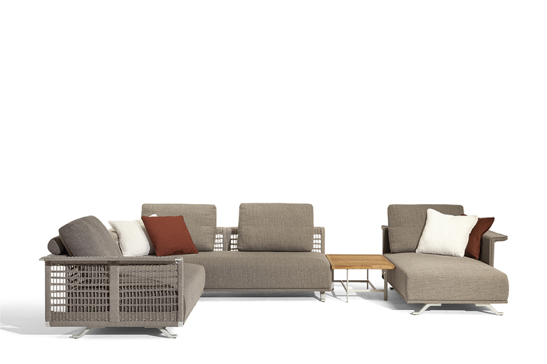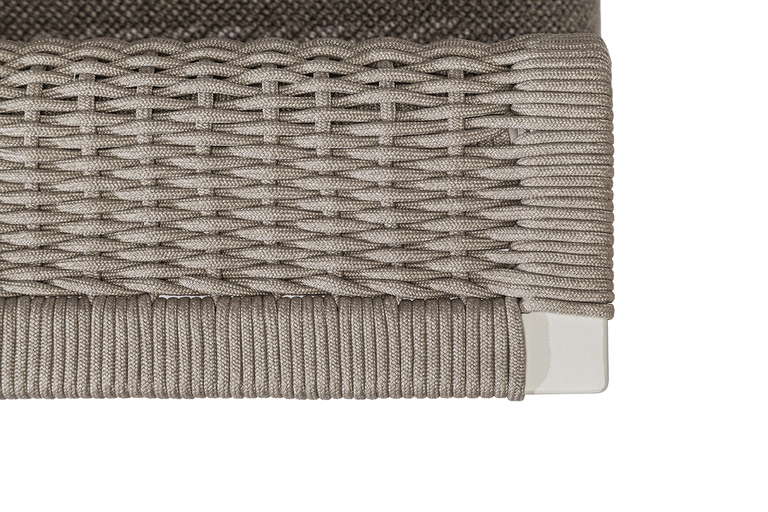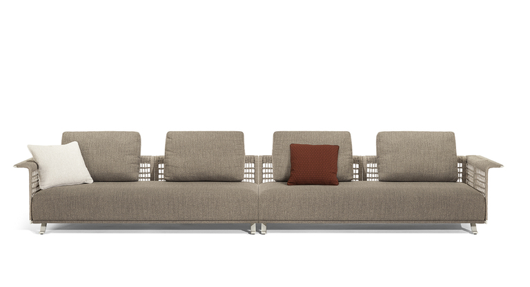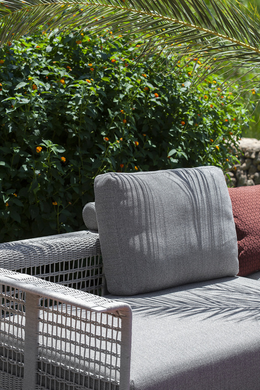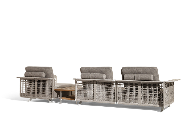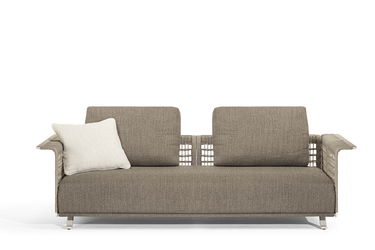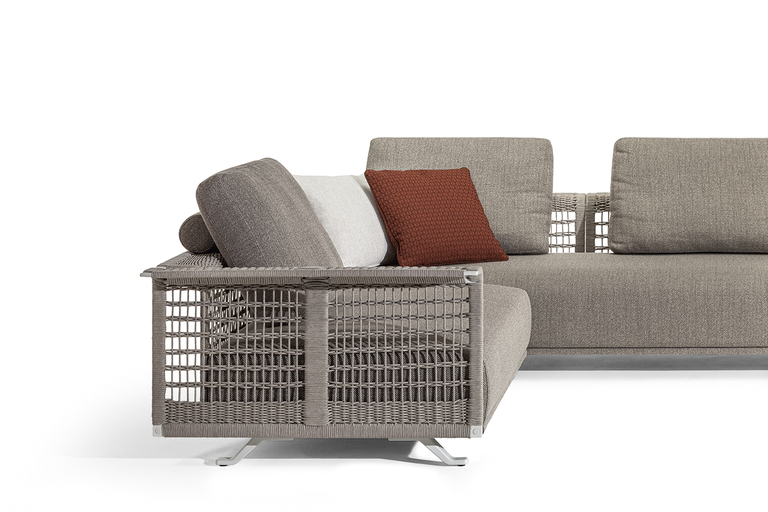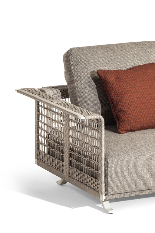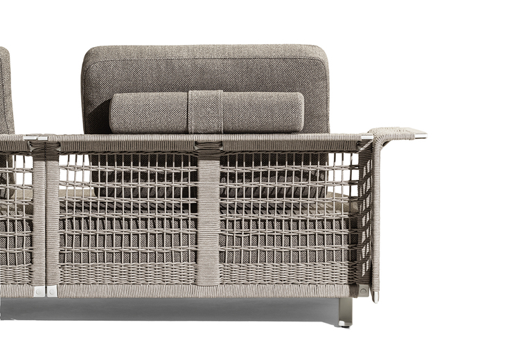 The structure is made of powder-coated lacquered stainless steel, supported by narrow feet. The armrests and backrest, also made of stainless steel, are covered with a handmade rope weave, with a pattern that thickens at the top and bottom. The padded elements are removable and covered with outdoor fabric soft to the touch. The outdoor cushions are designed to allow water to drain away, meaning that the sofas dry quickly and can be supplemented with other optional cushions to give extra support to the backrest.