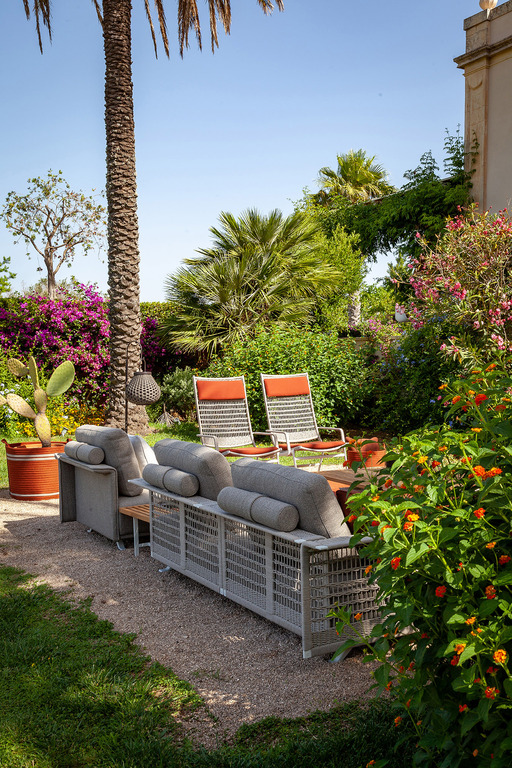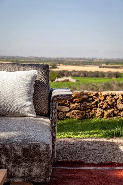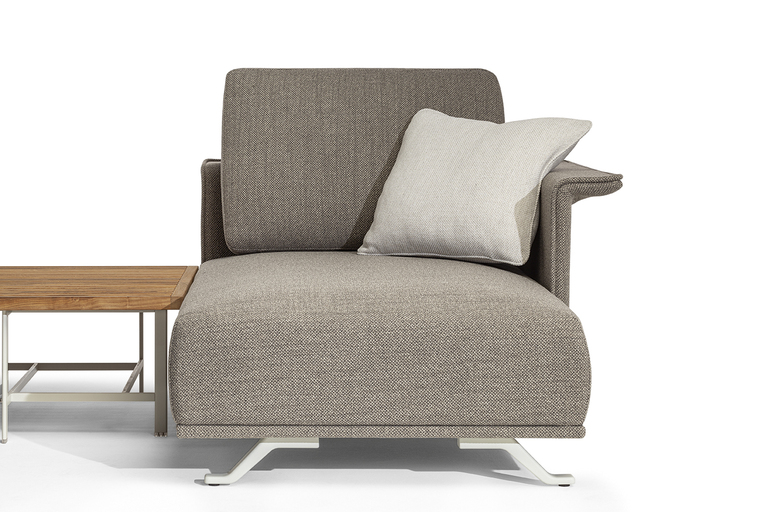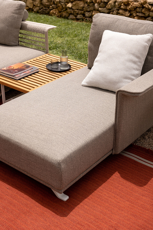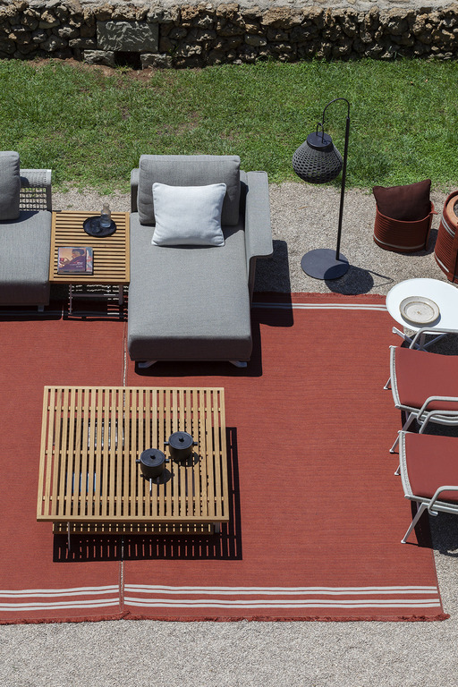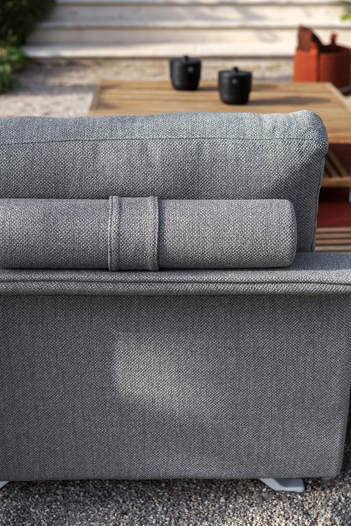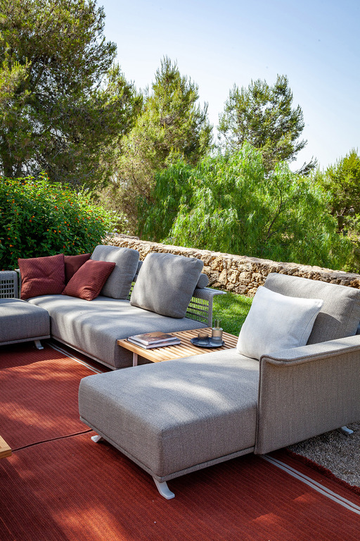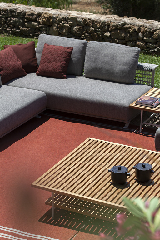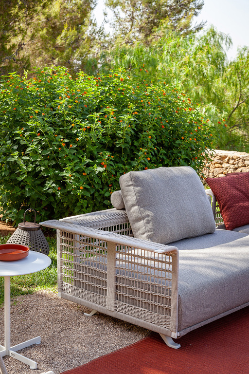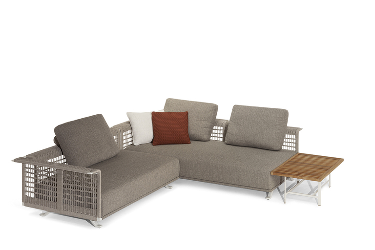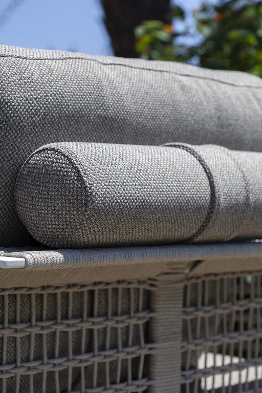 The structure is made of powder-coated lacquered stainless steel, supported by narrow feet. The armrests and backrest, also made of stainless steel, are covered with a handmade rope weave, with a pattern that thickens at the top and bottom. The padded elements are removable and covered with outdoor fabric soft to the touch. The outdoor cushions are designed to allow water to drain away, meaning that the sofas dry quickly and can be supplemented with other optional cushions to give extra support to the backrest.