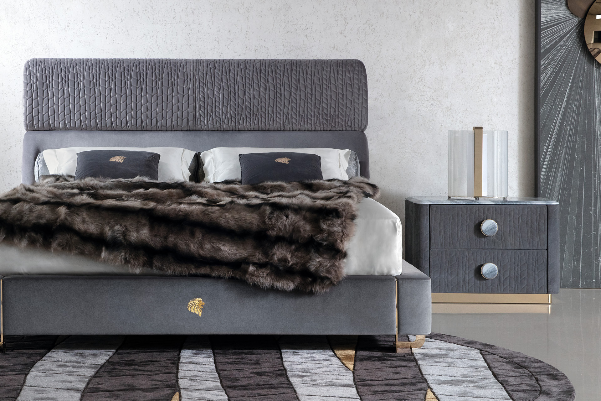 Night table with top in beveled marble. Base in light gold chrome stainless steel. 2 big center handles in combination with gold chrome stainless steel and beveled marble. 2 full extension drawers with bottom part in velvet fabric.