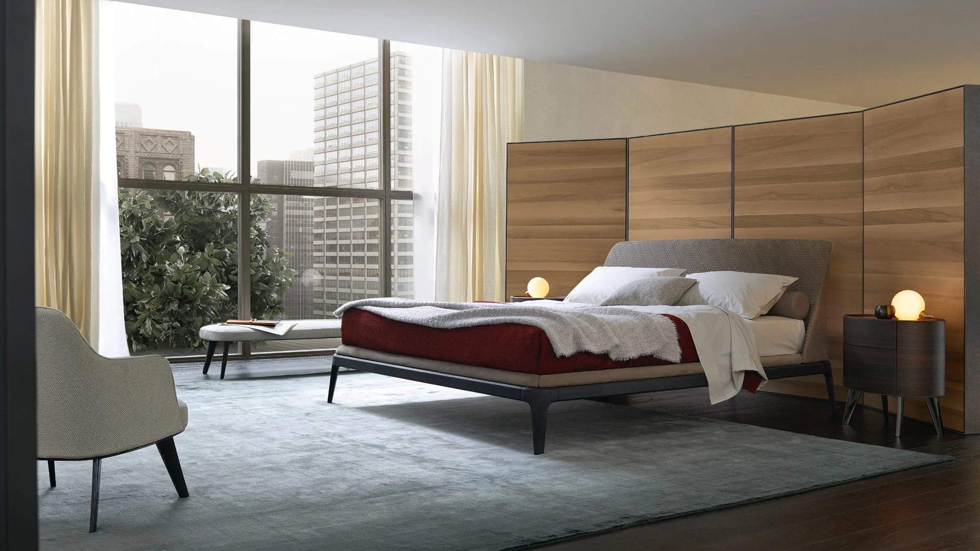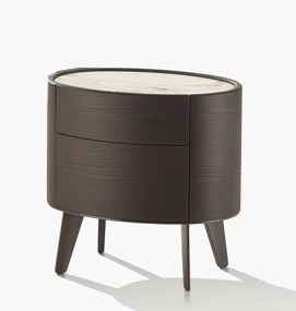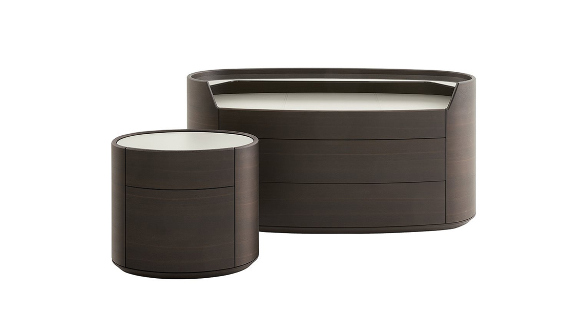 The Kelly chest of drawers and bedside table feature curved and delicate lines that reference those of the bed, which they compliment naturally. Perfect ovals formed through impeccable craftsmanship, they are available with feet or in floor-standing versions. Like the bed, the Kelly chest of drawers and bedside table also feature sophisticated finishes such as gold walnut for the frame and fronts, champagne metal for the feet and Zecevo marble for the top. For modern bedrooms, where even the smallest details are instilled with elegance.
