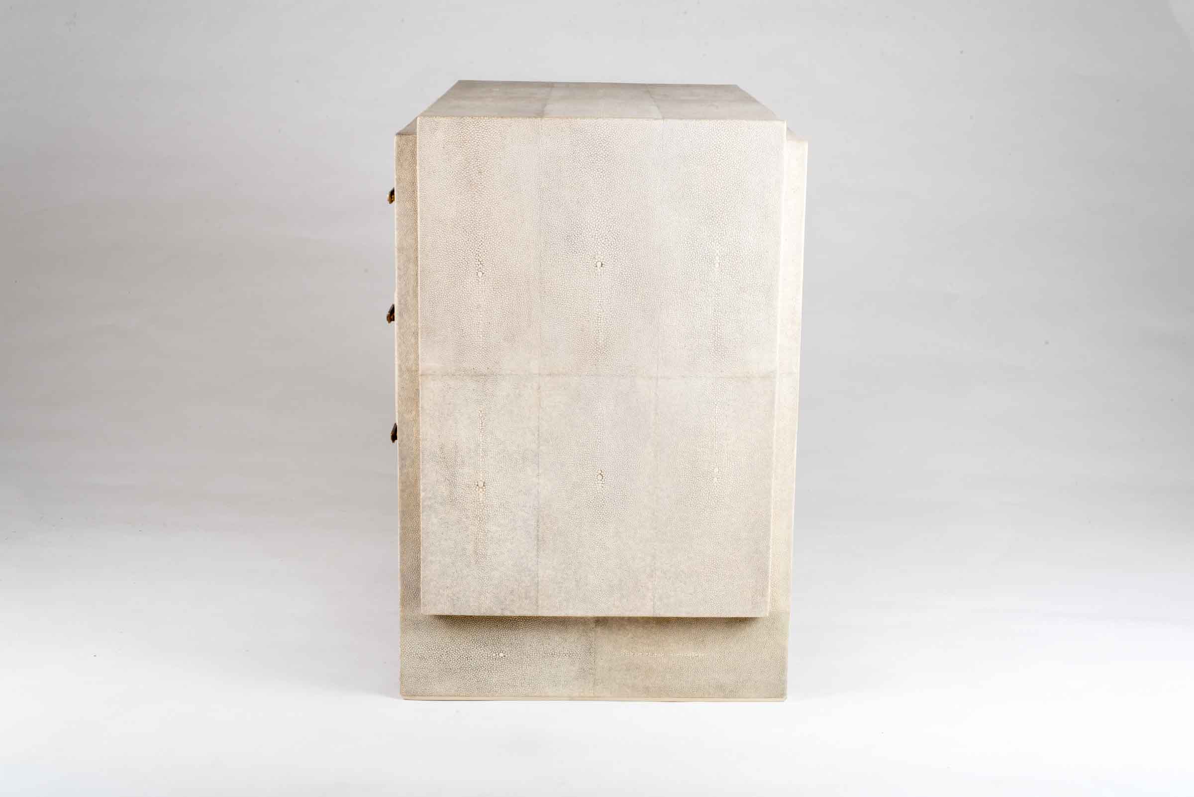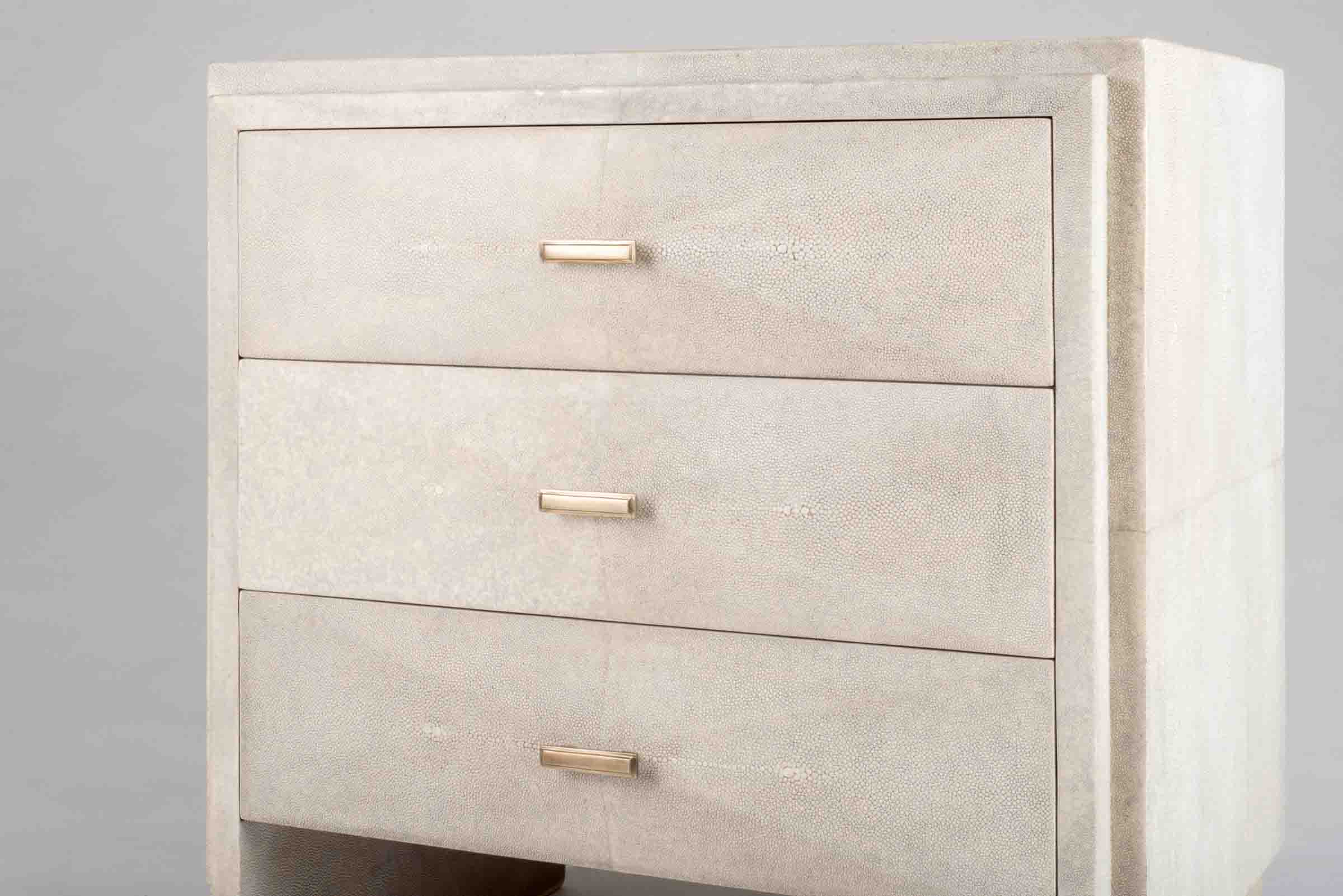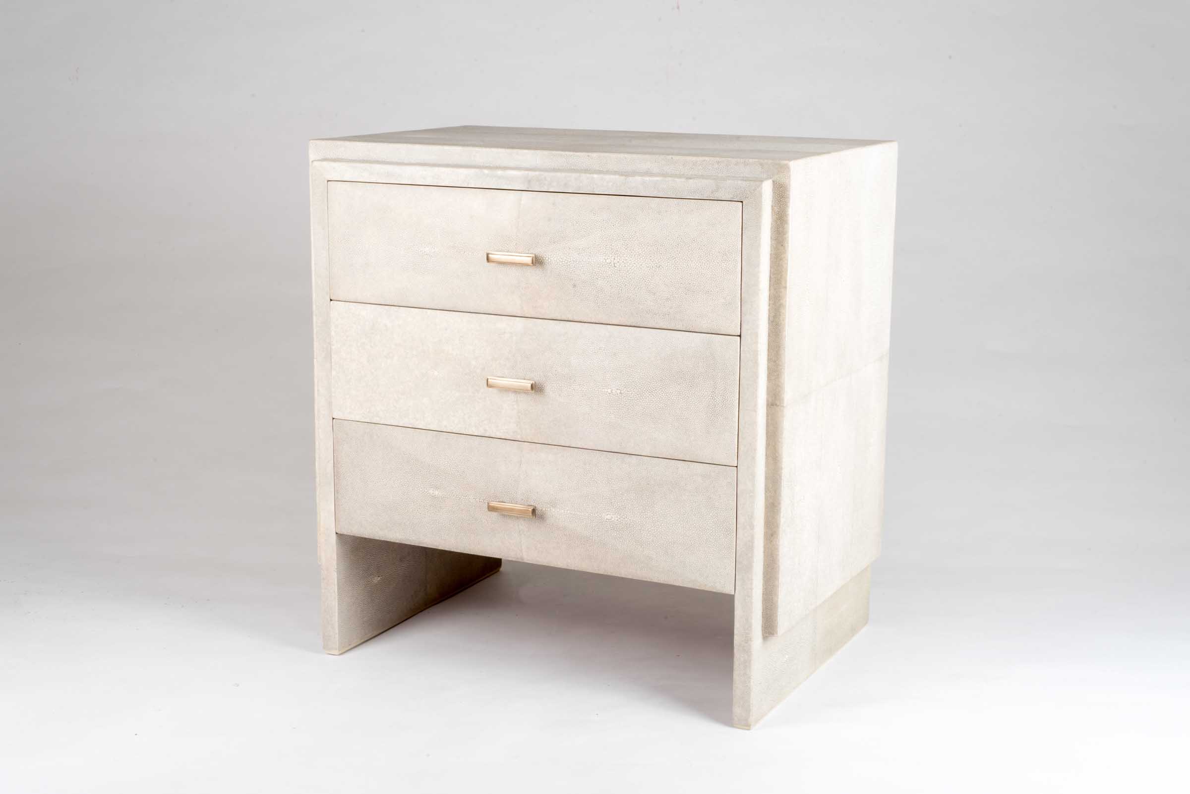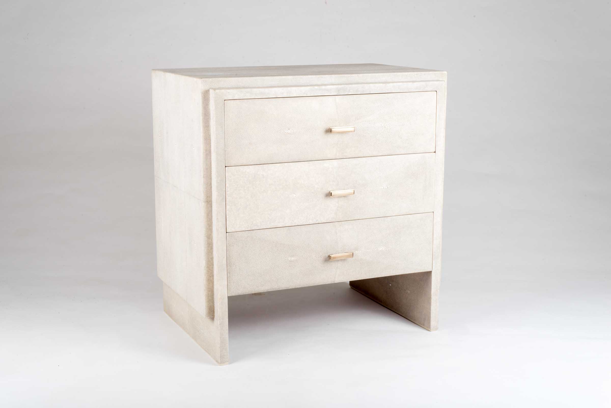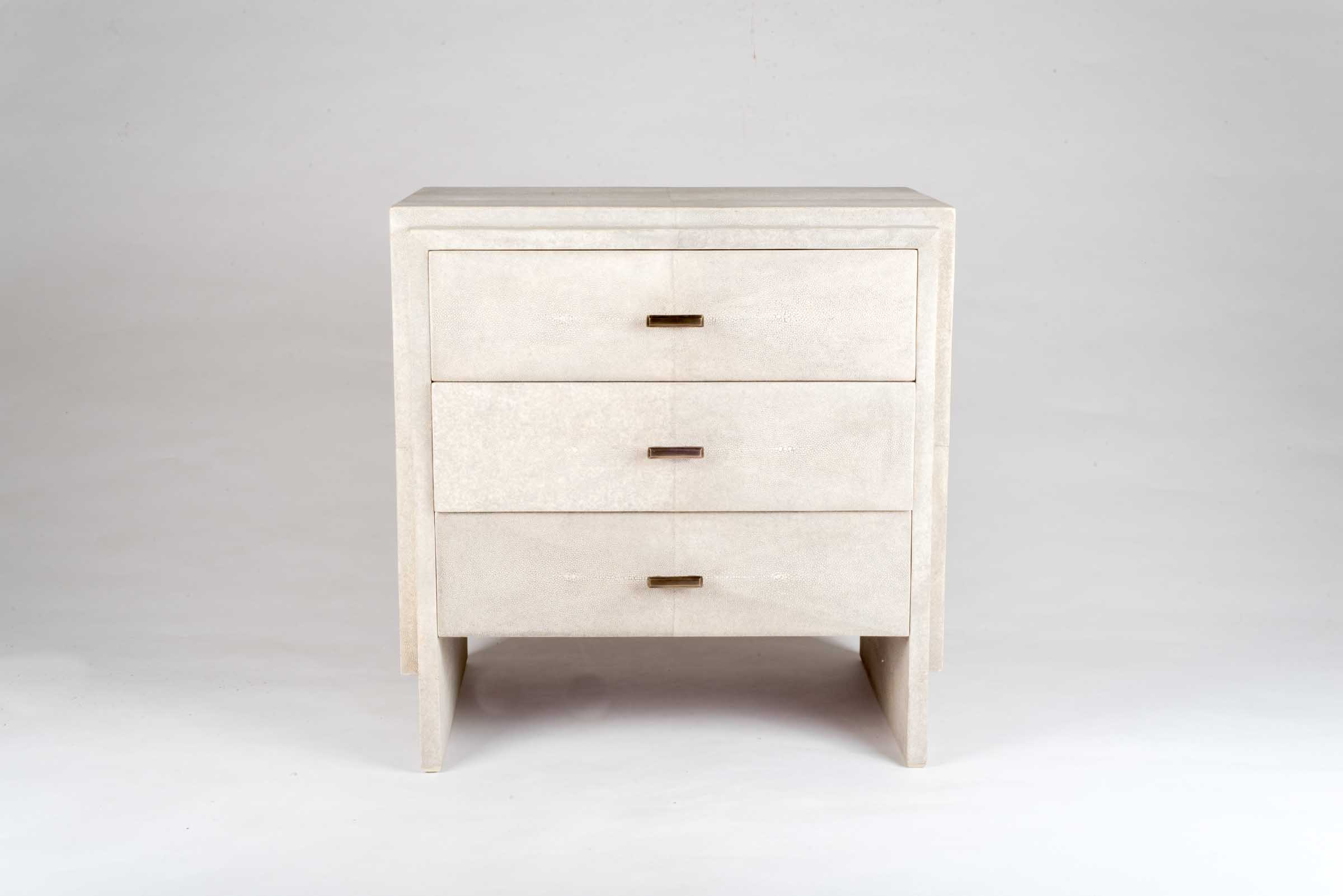 This Iconic Bedside Table features three subtle geometric drawers, accented with bronze-patina brass handles.
