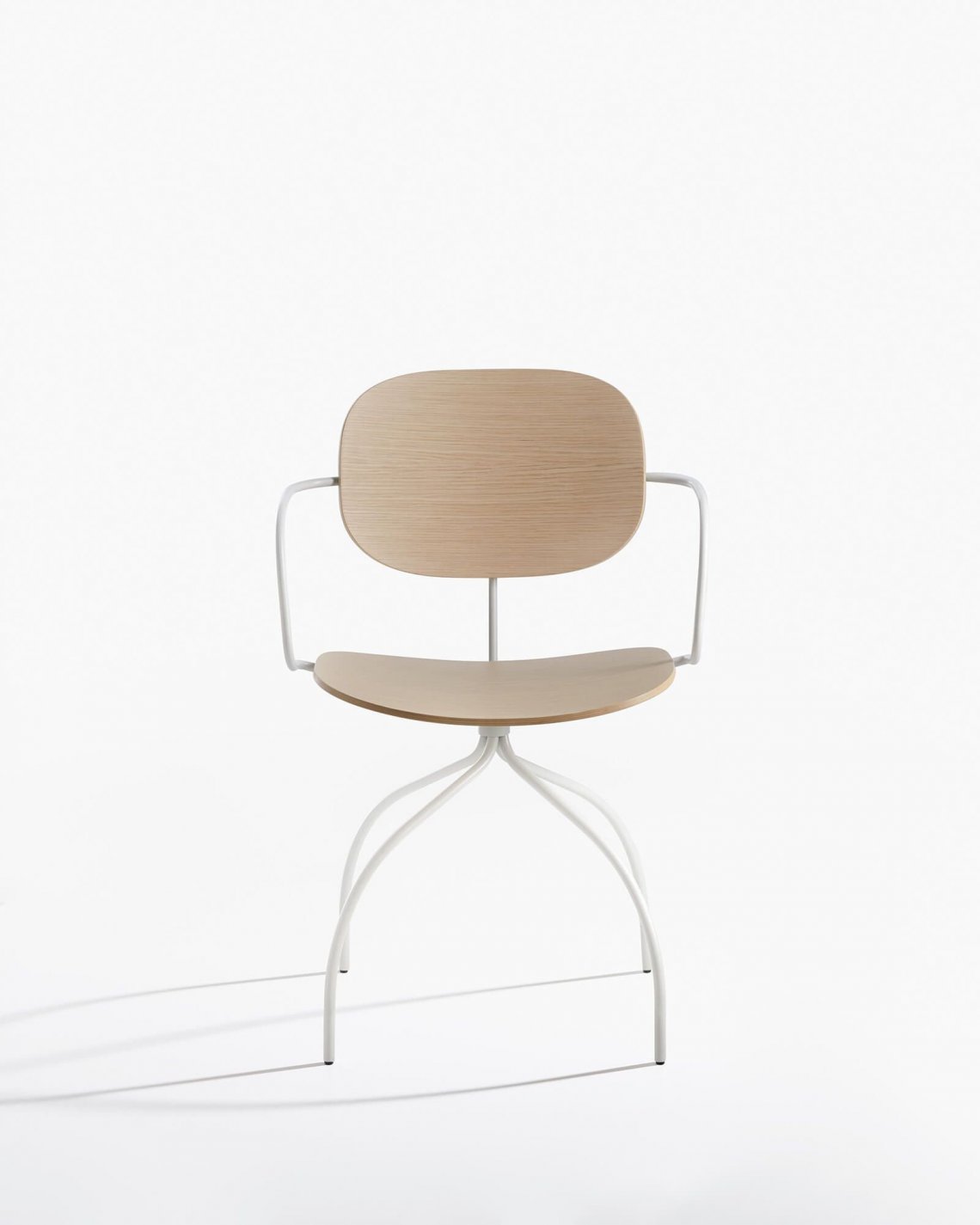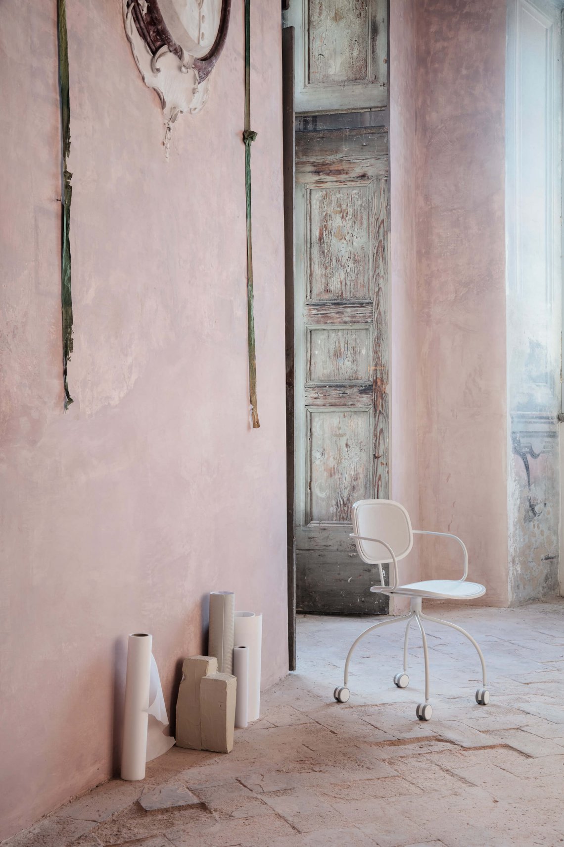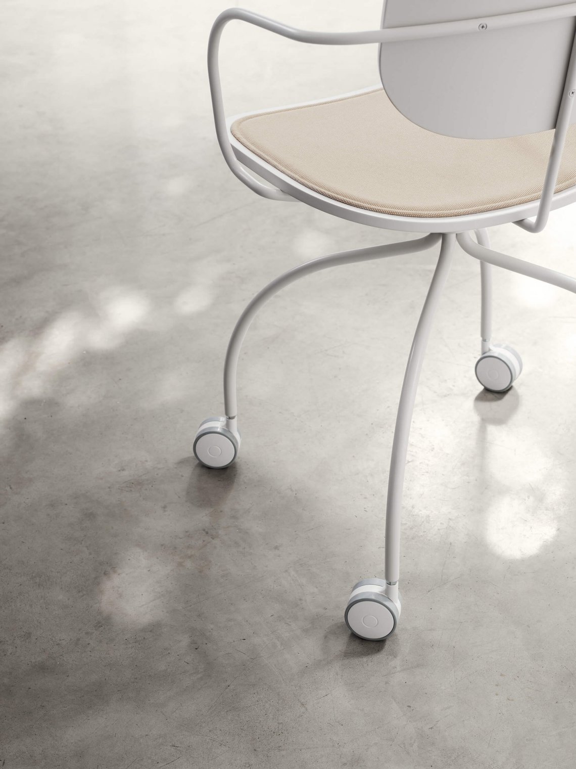 Magenta is a meeting chair, dedicated to the most free and informal workplaces, on glides or pivoting castors. Around service tables or independent in the spaces of the comfort zones, this chair can give a sense of elegance to professional environments. The structure is made of a thin metal rod which draws a three-dimensional form in the space. Above, equally sharp lines define the armrests and wrap around the backrest.