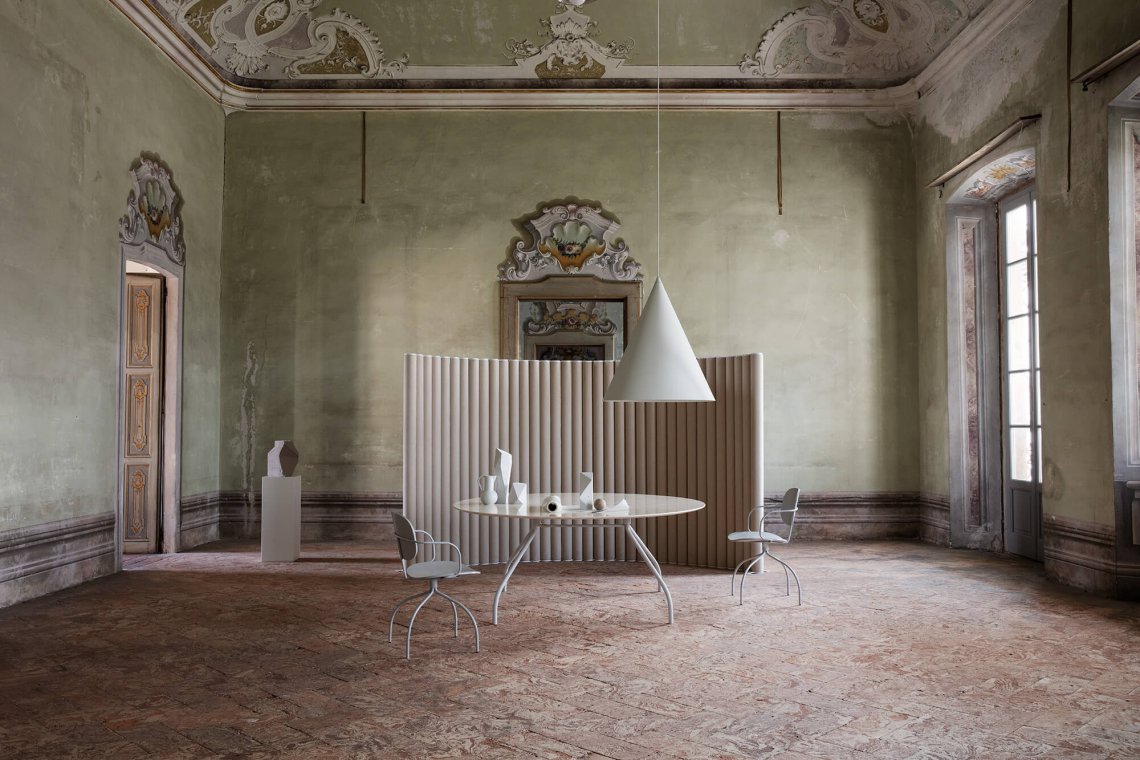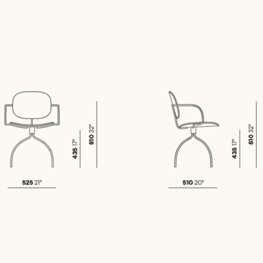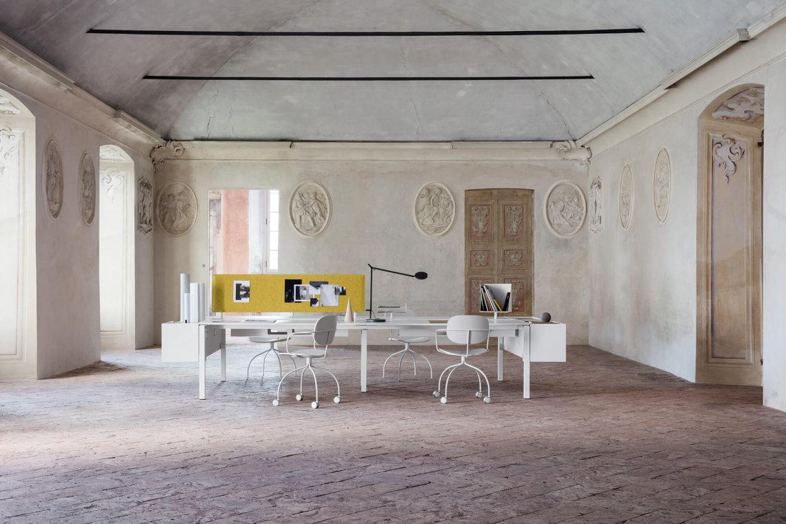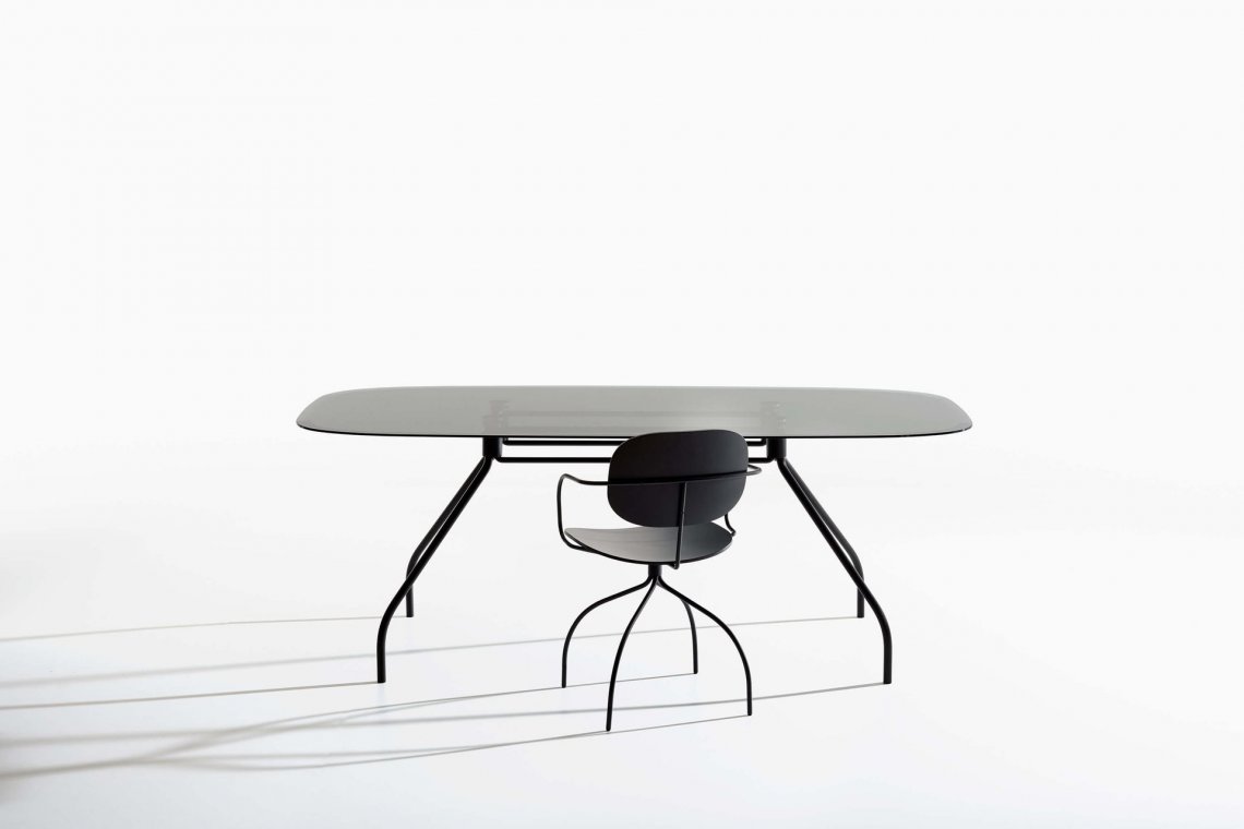Magenta is a meeting chair, dedicated to the most free and informal workplaces, on glides or pivoting castors. Around service tables or independent in the spaces of the comfort zones, this chair can give a sense of elegance to professional environments. The structure is made of a thin metal rod which draws a three-dimensional form in the space. Above, equally sharp lines define the armrests and wrap around the backrest.