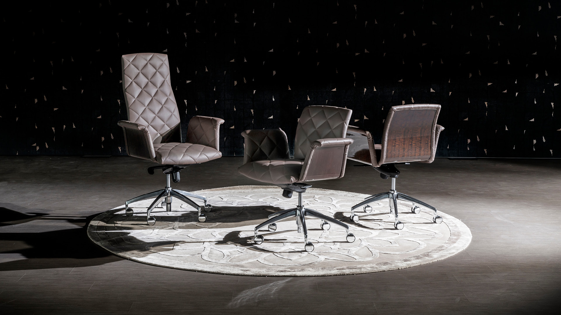 Guest desk chair on rollers w/ adjustable height, back and side panels in high gloss polyester curly eucalyptus. Avaible in first grade leather, velvet or suede fabric.