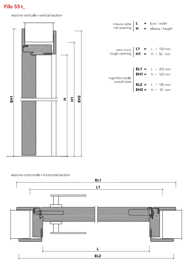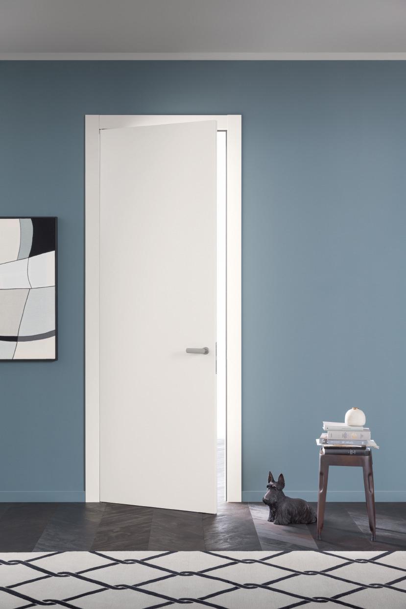 Swing wood door 55 mm thick. Magnetic lockset, concealed hinges and anti-noise gasket included. Trim 12 mm thickness: flush with the door on the push side (filo S) or flush with the door on the pull side (filo T). Telescopic wood trim for wall thickness from 105 to 130 mm; available for max wall thickness 500 mm.