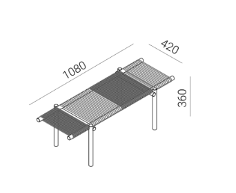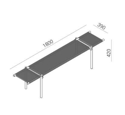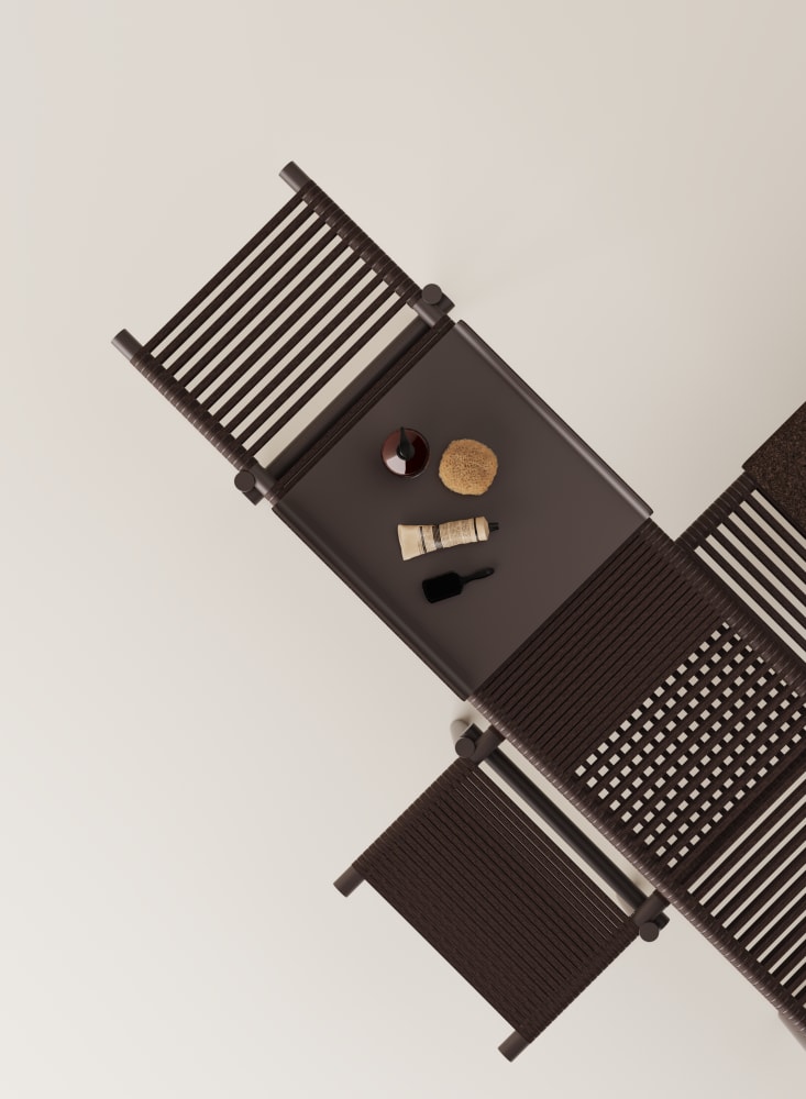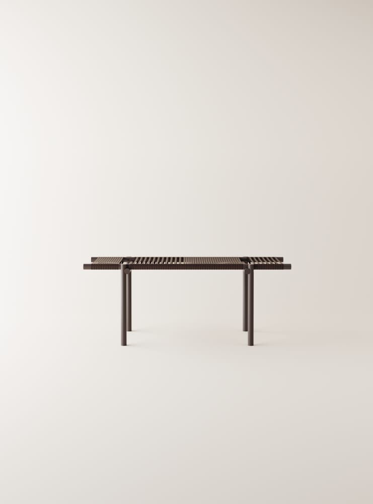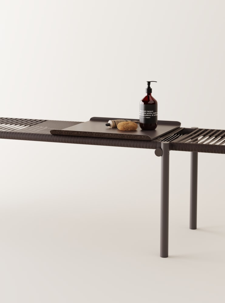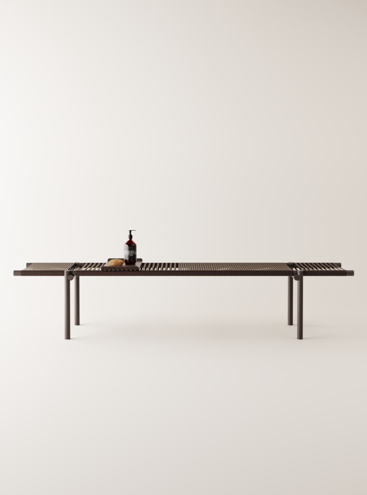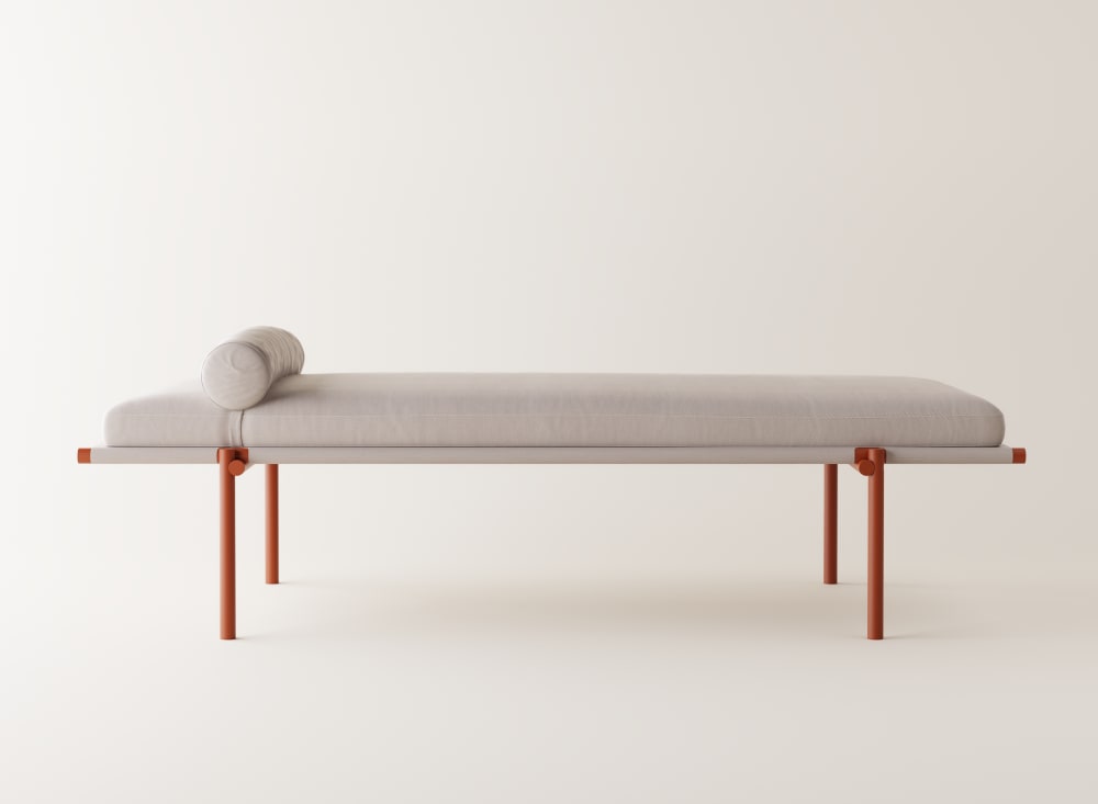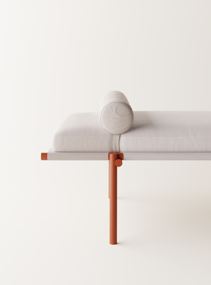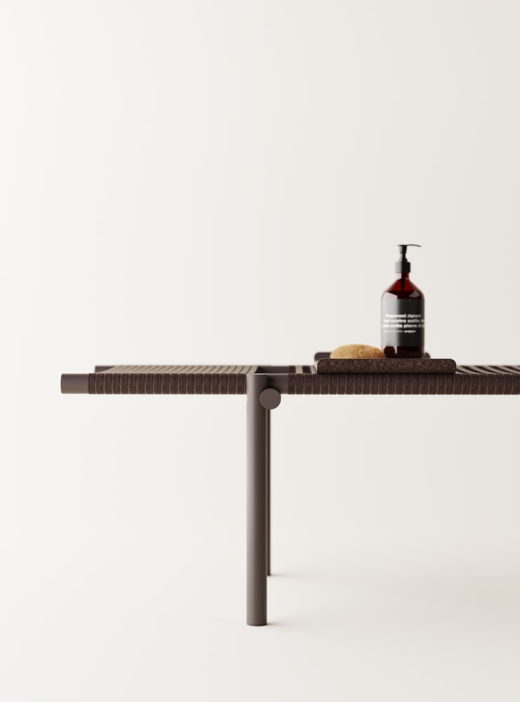 Three daybed benches in three different heights can be used individually or stacked as desired, creating a space to sit, have a conversation, or stretch out and relax. The surface consists of hand-woven ropes of cork, with a technical metal core. The supports and frame are made of recycled aluminum tubing painted in a warm brick- red color. They are designed to be water- resistant, giving them a place in a home environment as well as in hotels and hospitality, even outside the bathroom or outdoors - the only limit is your imagination.