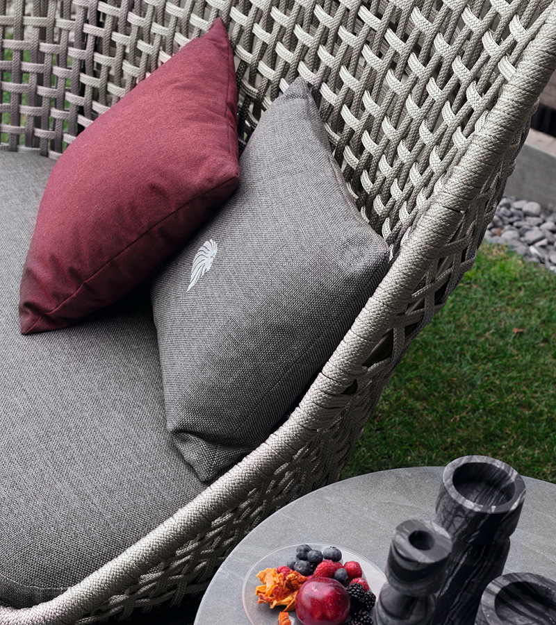 Outdoor occasional chair with high back available in special treated fabric or first grade leather. Cushion filling in waterproof dacron. Structure in combination of satined black metal treated in cataphoresis with inserted Giorgio Collection logo and woven cordage.