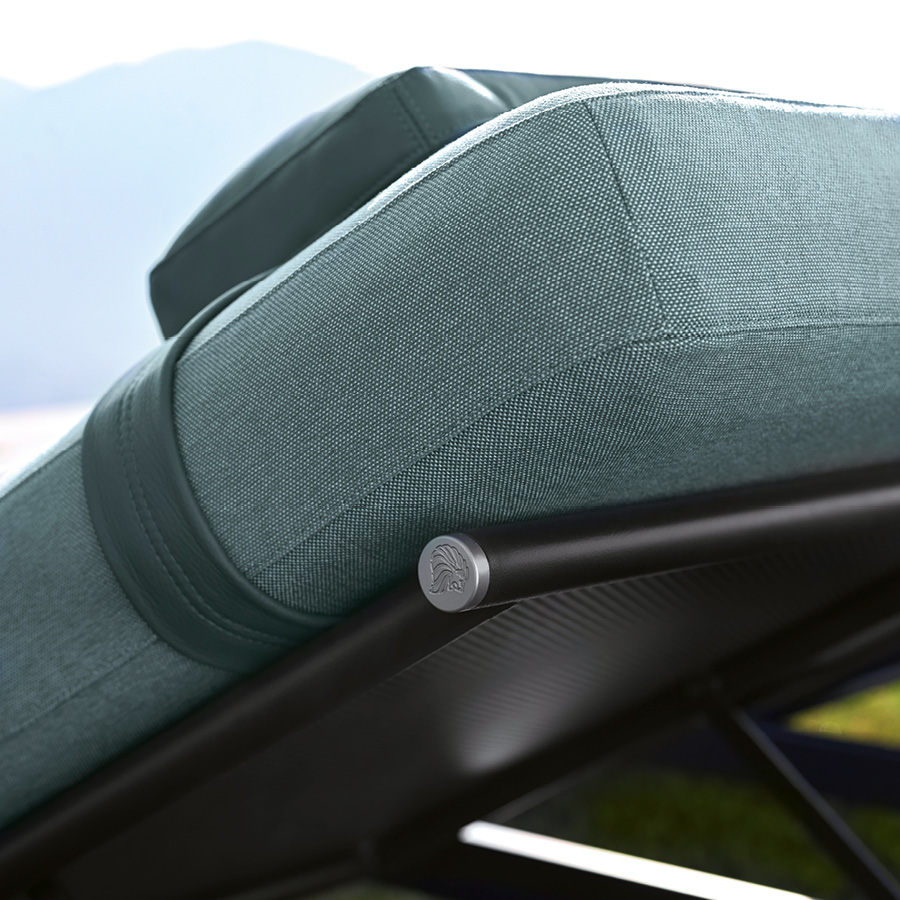 Outdoor sunbed available in special treated fabric or first grade leather. Headrest with embroidered Giorgio Collection logo. Structure in satined black metal with inserted Giorgio Collection logo and adjustable inclination.