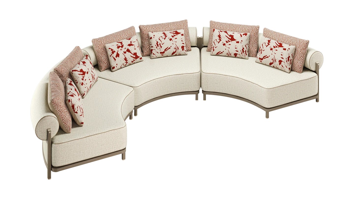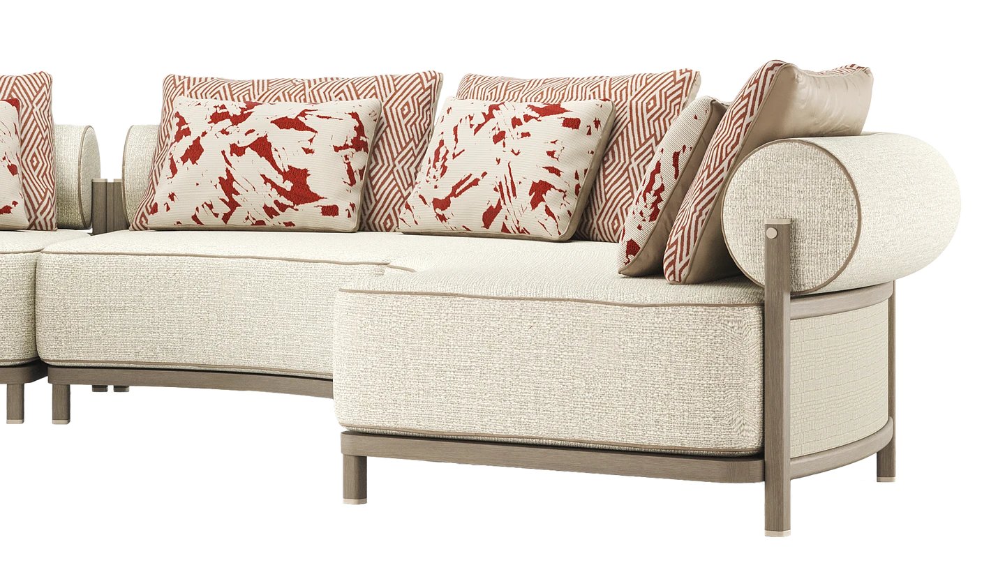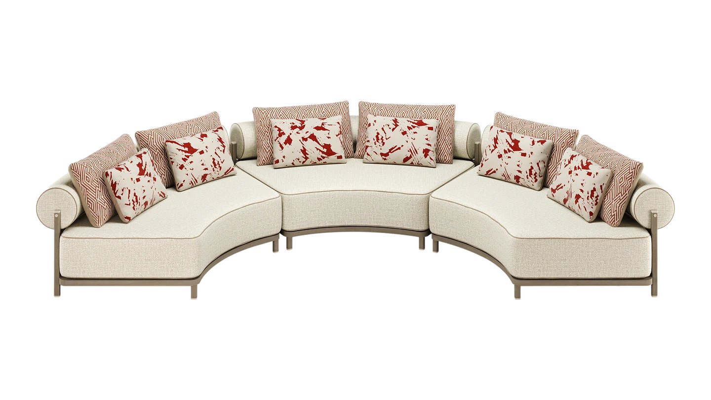 "Recline in the sun on our SAINT-TROPEZ Curved Sofa. The curved shape makes the perfect patio centrepiece, while the muted tones blend with the surrounding nature. Combining natural wood and stainless steel, it’s made to match the SAINT-TROPEZ Sun Loungers. The seating uses premium fabric and leather piping. "