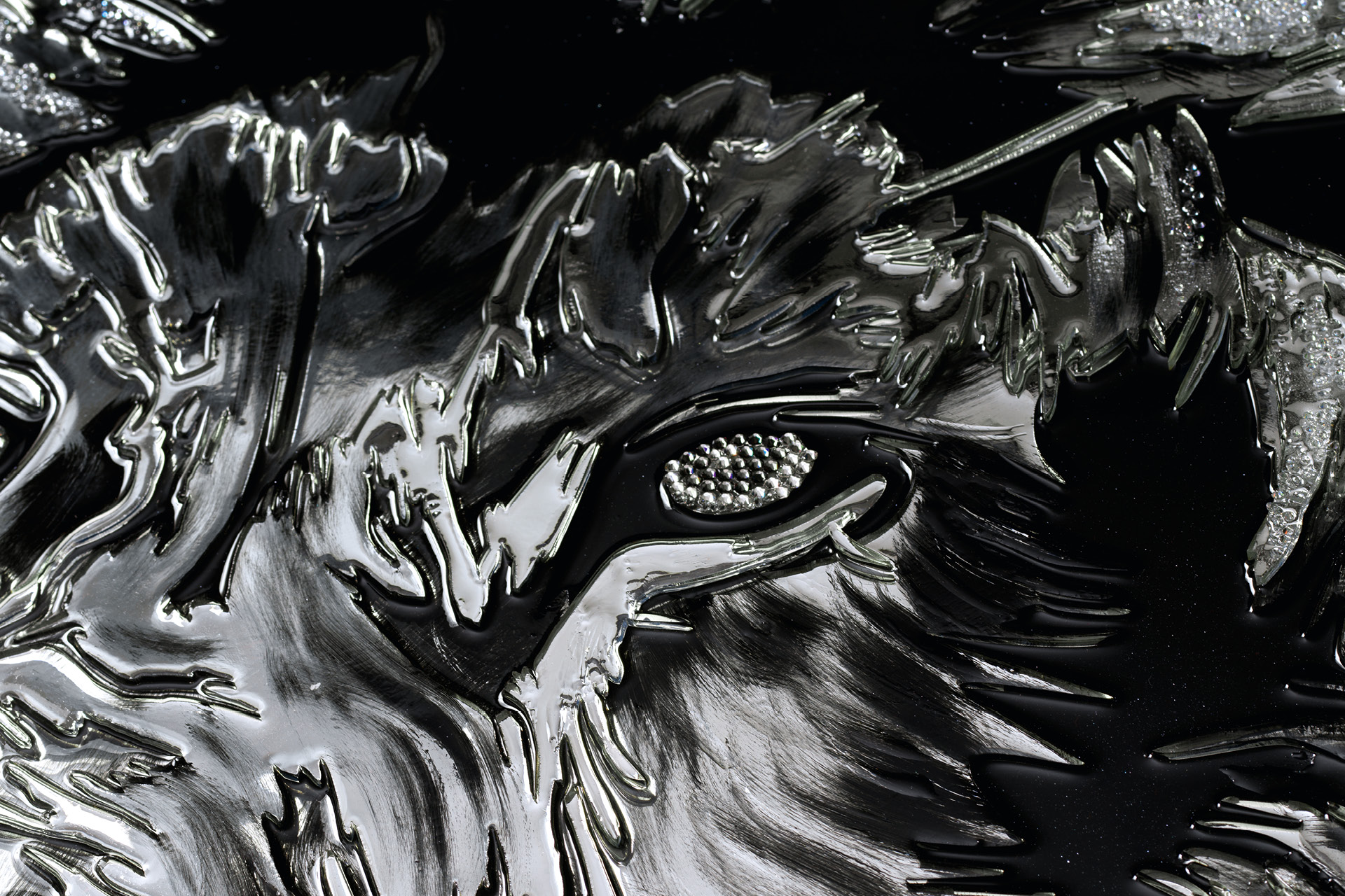 Rectangular painting in wooden structure with stainless steel frame. Epoxy resin with UV protection base in combination of "Swarovski” crystals and hand-cut clear mirror glass.
