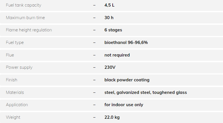 Rondo Automatic runs on ethanol using the same BEV? Technology that is known from our bestselling FLA3 automatic ethanol fireplace. It is dedicated for indoor use, does not require a chimney or vent or any hard connections. It is extremely efficient and burns on a full tank (4.5L) for approx. 30 hours. It is completely automatic with a remote control, app and control panel. Flame enclosed in a tempered glass cylinder ensures the safety and stability of the fire while burning.