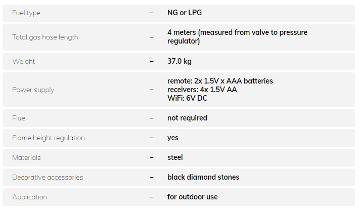 Galio Star Black is a portable outdoor fireplace in a black 950mm high casing. The shape of the burner resembles a six-pointed star, which makes the flame even more spatial and spectacular. Galio Star is a sure solution to extend your late-night meetings, as it lets you bask in a pleasurable warmth. The minimalistic design of the black casing will fit perfectly in your garden and make it its central point. Control your automatic fireplace with a control panel or a remote.