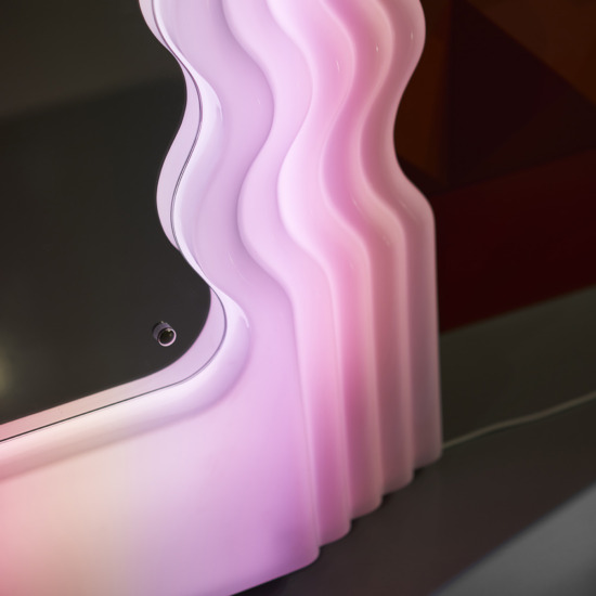 Ultrafragola mirror/lamp, with its sinuous profile that suggests long wavy hair, belongs to the Mobili Grigi series of complete bedroom and living room furnishings designed by Ettore Sottsass for Poltronova and presented at the third edition of Eurodomus in 1970. With the exception of Ultrafragola, the models never got beyond the prototype phase.