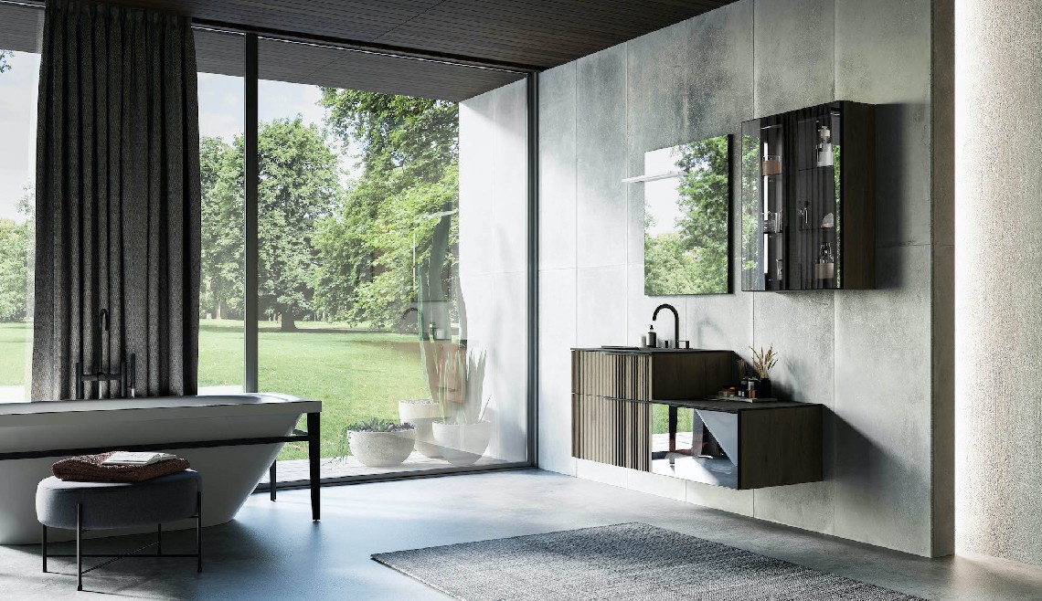 Surfaces and volumes play together. Surprising and captivating the effect of the Vertigo fronts next to the black aluminium and stop-sol glass frames. All elements with aluminium door and stop-sol glass can be equipped with optional interior lighting. Minimal design for the new BLADE accessories line.