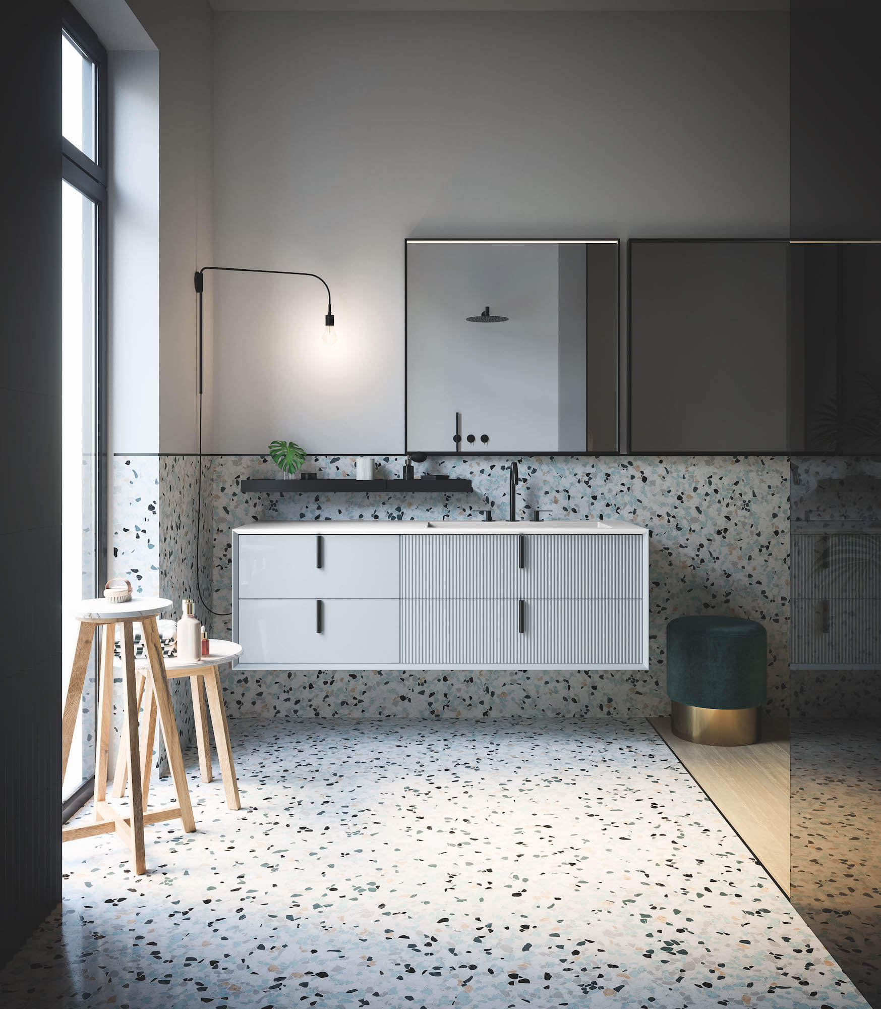 VERTIGO can become a decorative element that, wisely dosed, creates extraordinary effects, merging with the other PUNTOTRE collections. In this composition it meets MODULA and plays with the contrasts between glossy and matt. A High Tech mirror, with a matt black aluminium profile, which can be equipped with lighting and managed to various specifications, this is the new BLACK mirror. In detail we appreciate the capacious Tecnoril top basin and the targeted contrast with the “total black” of the mixer group, ideally connected to the handle.