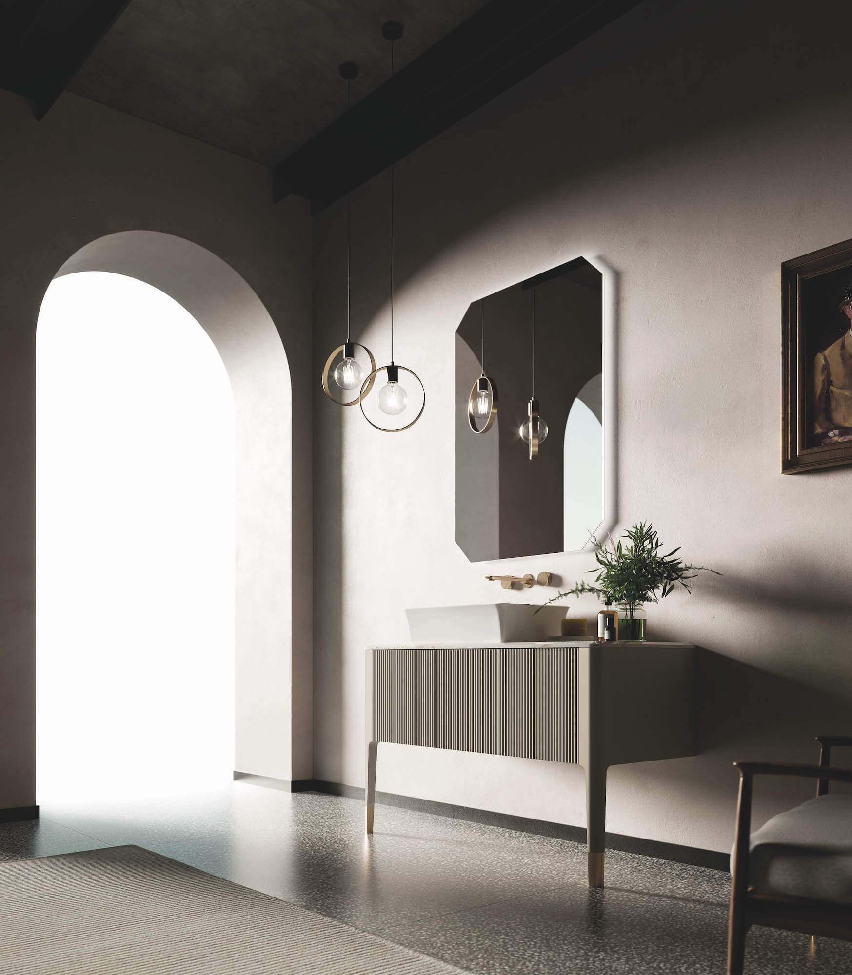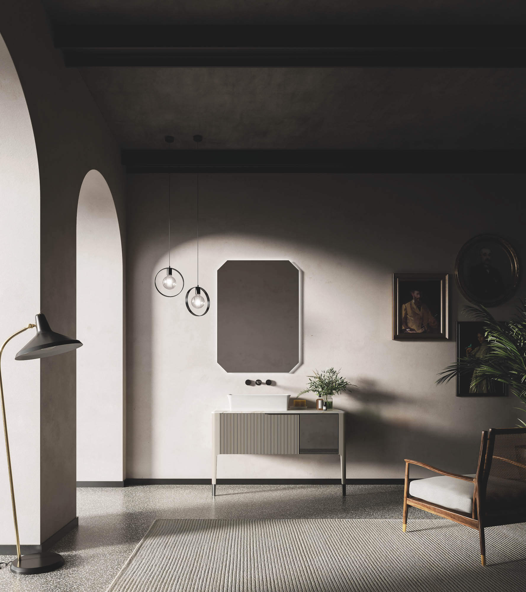 The grazing light highlights the interplay of the three-dimensional volumes of the VERTIGO fronts, while the OTTAGONO BIG mirror helps to reinforce the mix of modern and classic in this ART-inspired solution. Note the elegance of natural stone with optional bevelled profile, a touch of exclusivity in a fascinating piece of furniture.
