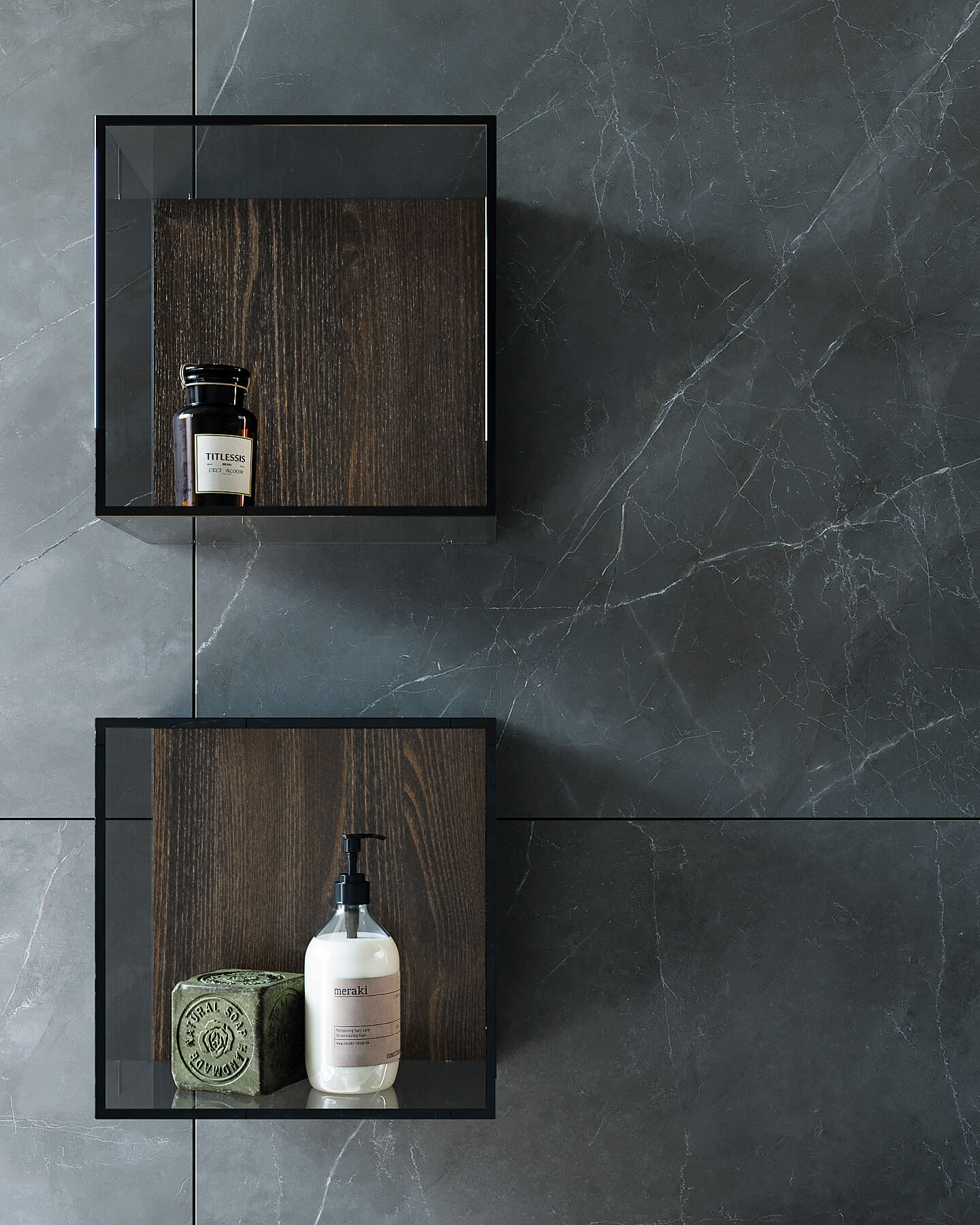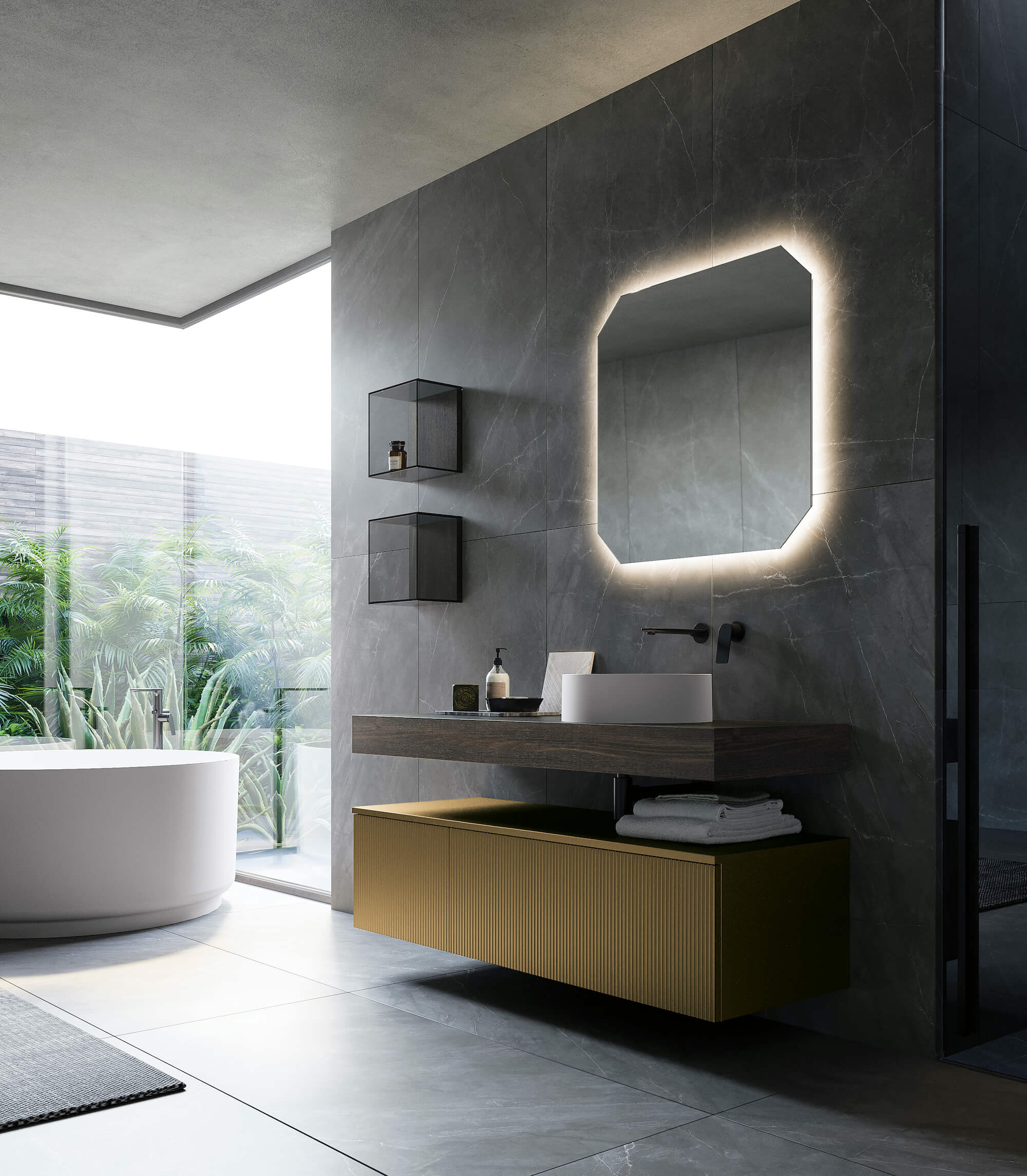 Sophisticated and functional, an environment that arouses feelings of relaxation and well-being. PUNTOTRE’s advanced technologies allow the realization of these extraordinary polymeric boxed tops, a high performance product. Almost an ornament, the washbasin rests on the surface of the Thermo A polymeric top.