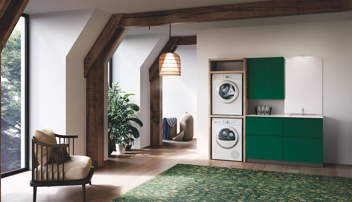 The construction of our structures, also allows solutions suitable for housing both washing machine and dryer, for the optimization of space and functionality. The Ocritech top with integrated wash-tub, besides being extremely elegant, represents an ideal solution for maintenance and cleaning. The bathtub illustrated here is one of the most spacious in the range of proposals of Laundry Puntotre.