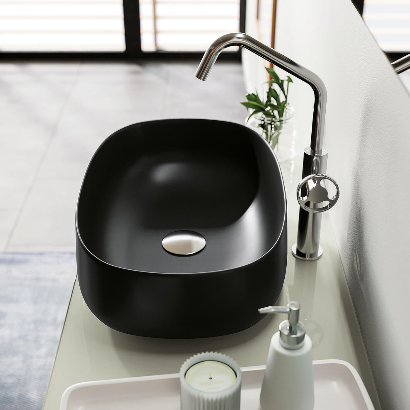 The matt black ceramic underlines with a distinctive feature the exclusivity of this composition, also thanks to the contrast between the polished surface of the glass. The deeper drawers can be equipped internally with practical metal dividers. Please note that all our drawer runners are full extension, to guarantee full usability of the space.