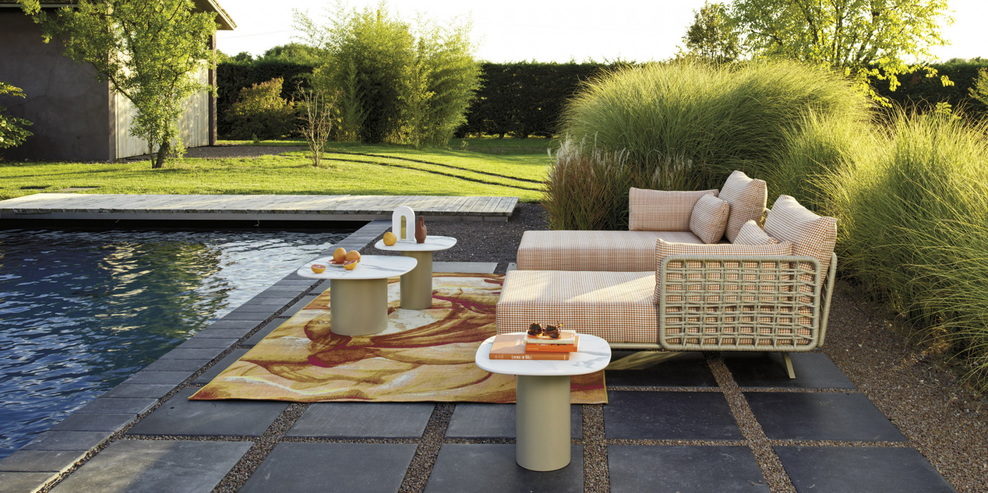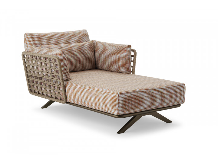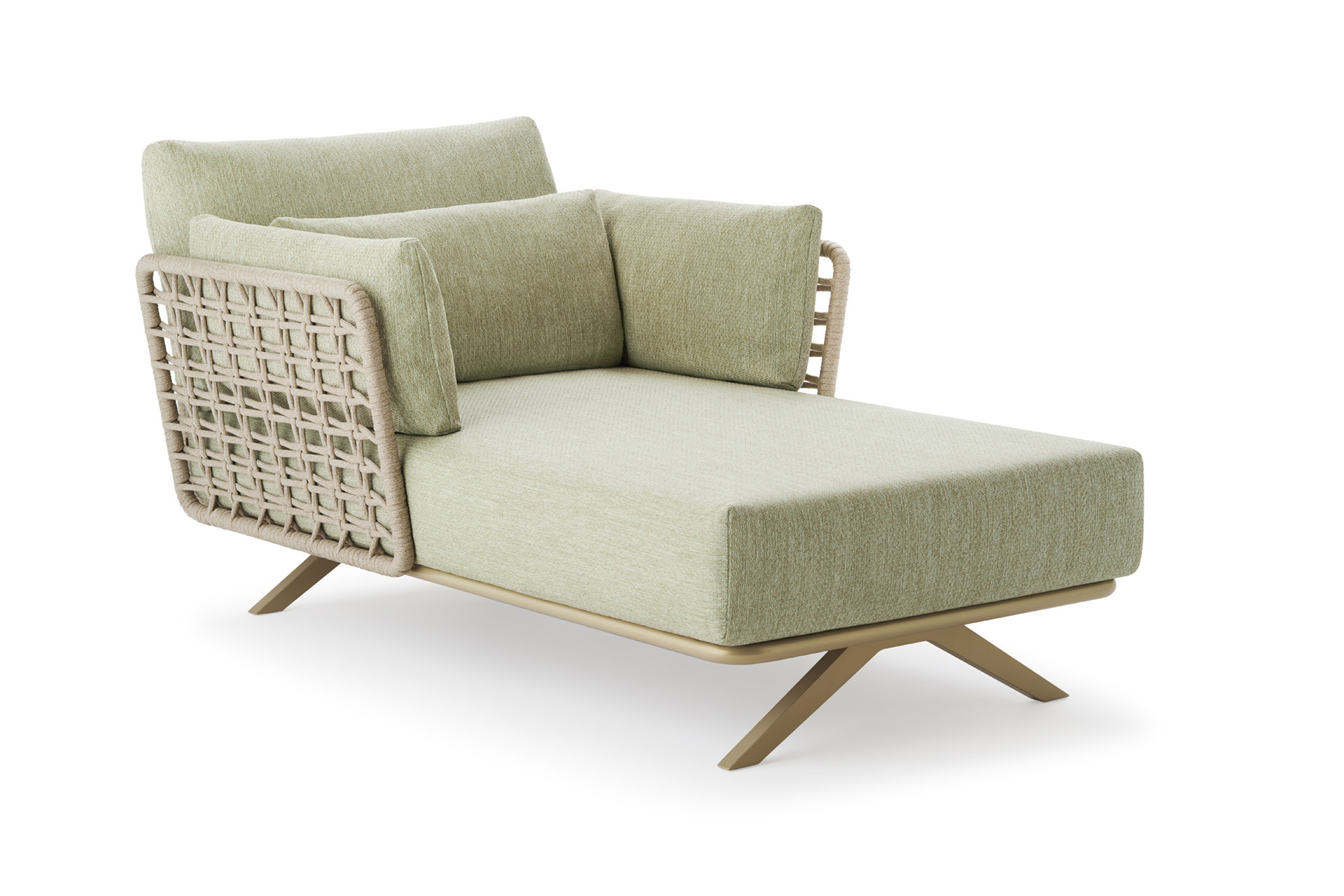 Chaise longue  in acciaio inox Aisi 304 ed alluminio, verniciata a polveri ed intrecciata in Oval Trendyrope. Linee che valorizzano l'iconico stile italiano, dove le lavorazioni in corda donano un'estetica materica ed artigianale alla morbidezza avvolgente delle sedute, per concepire uno spazio ideale, dedicato al relax e alla socializzazione. Progettata sia per l'arredamento residenziale che contract, outdoor e indoor.