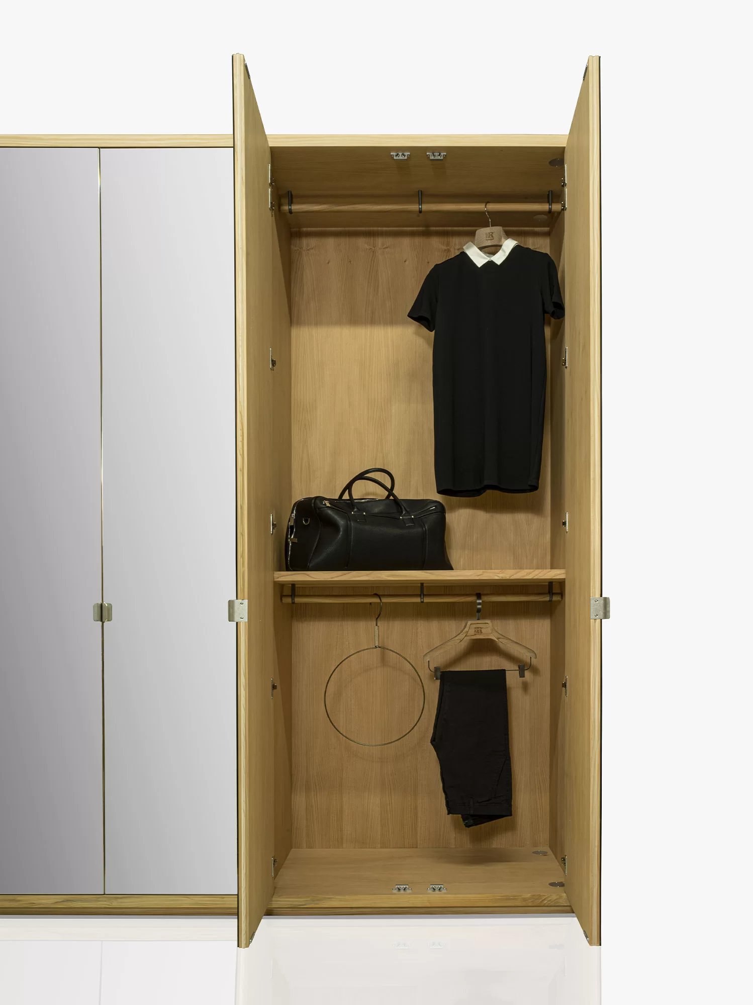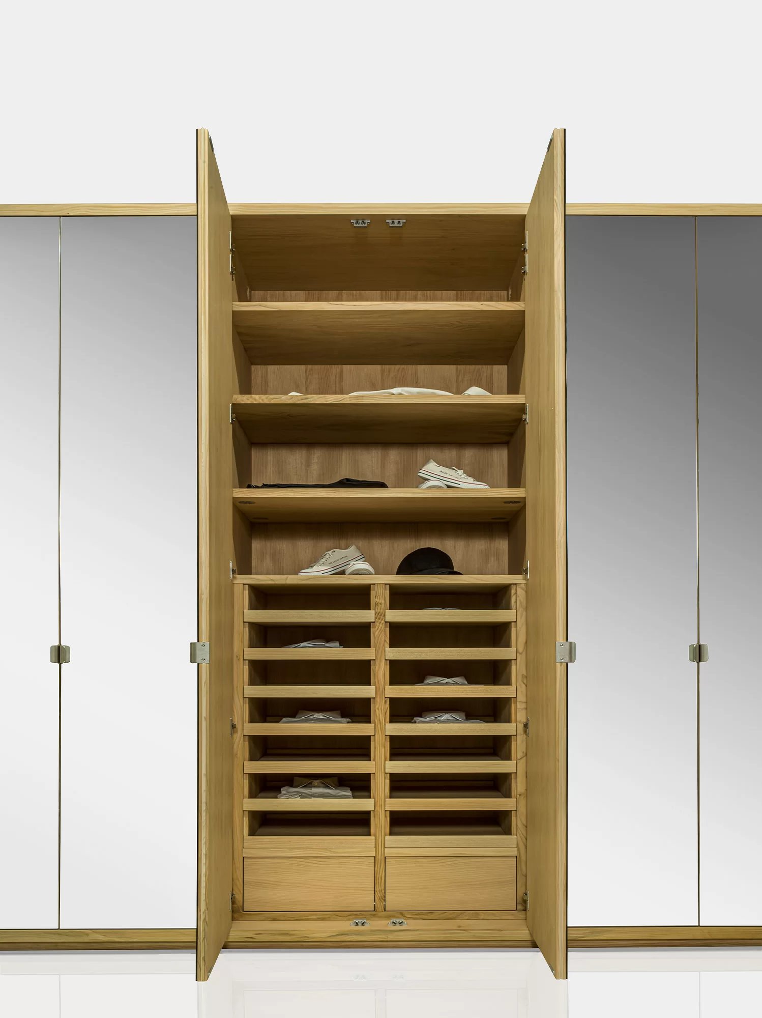 Armadio in legno massello e listellare, caratterizzato da ante battenti a specchio e telaio in legno massello, con interni in legno di cedro profumato, naturale rimedio contro le tarme. Personalizzabile con l’inserimento di appendiabiti, ripiani, cassettiere in legno massello con tradizionale incastro a coda di rondine e accessori vari, propone un’organizzazione funzionale e componibile dei vari elementi sulla base delle esigenze contenitive e delle dimensioni richieste.