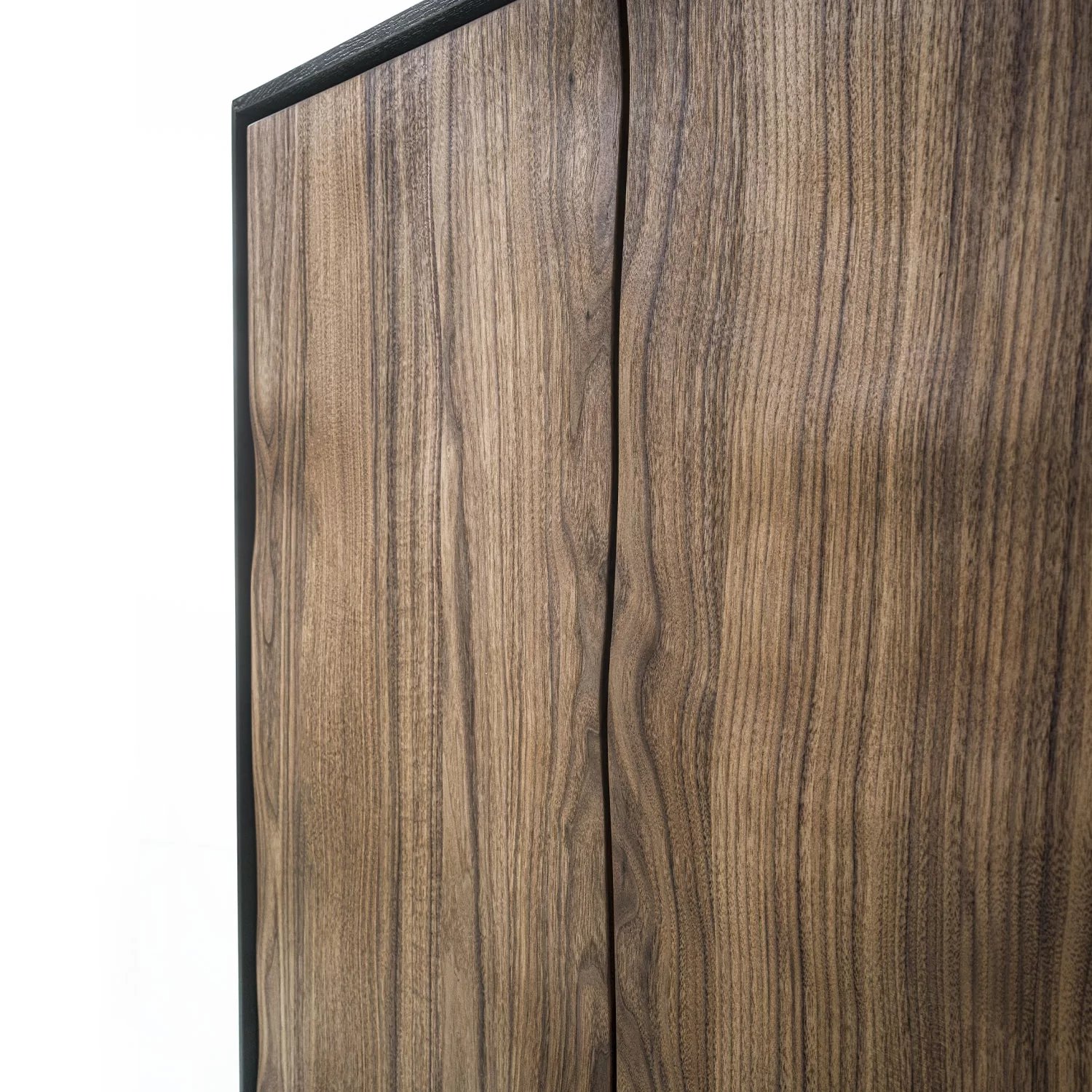 Credenza alta in legno massello e listellare, racchiusa da cornice in legno. All’interno ripiani e cassetti assemblati con tradizionali incastri a coda di rondine e maniglia fresata passante. La particolare lavorazione sulle ante crea un effetto scultoreo attraverso l’estroflessione del legno, donandole un movimento sinuoso.