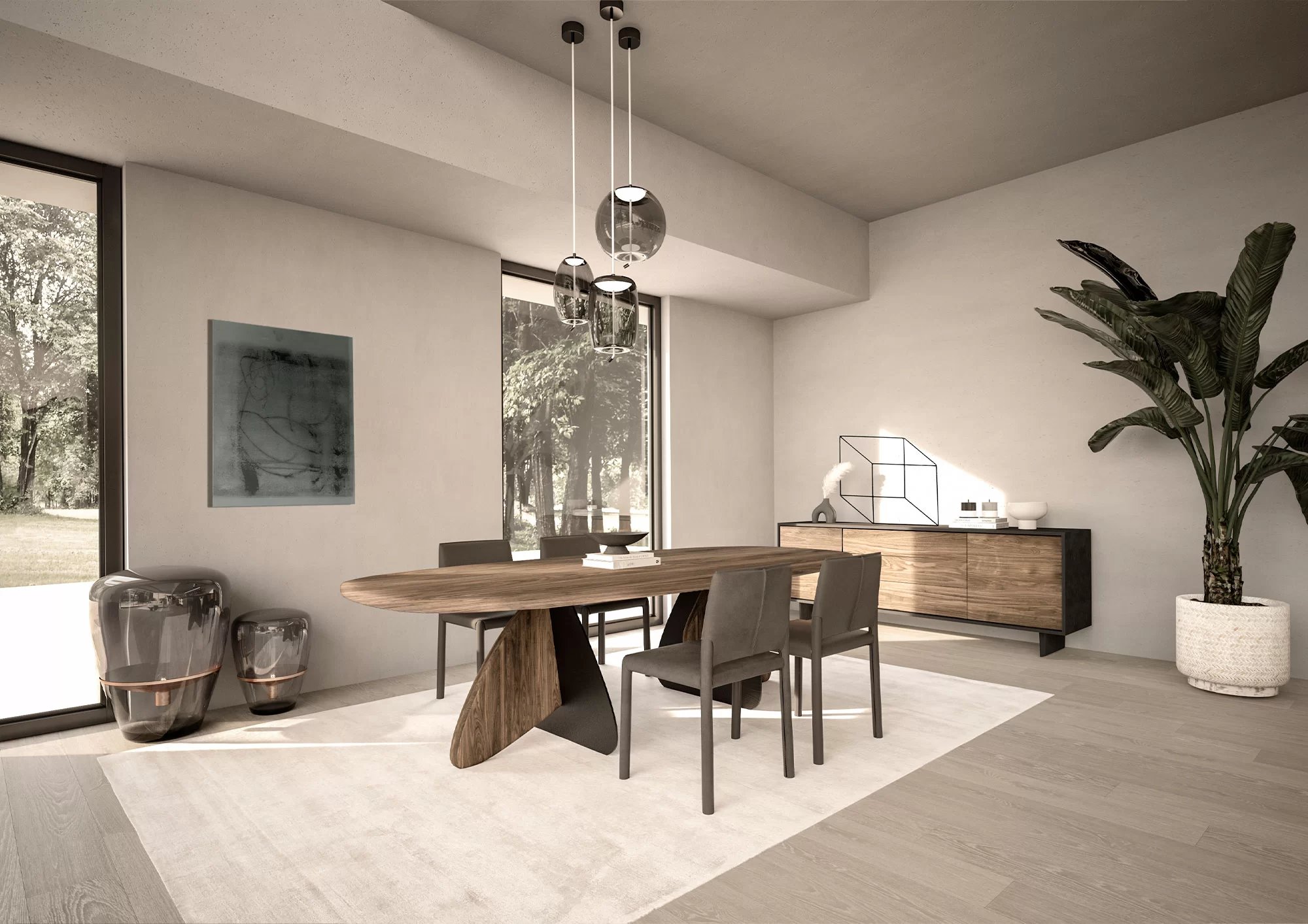 Credenza in legno massello e listellare, racchiusa da cornice in legno. La particolare lavorazione su ante e frontali dei cassetti crea un effetto scultoreo attraverso l’estroflessione del legno, donandole un movimento sinuoso.