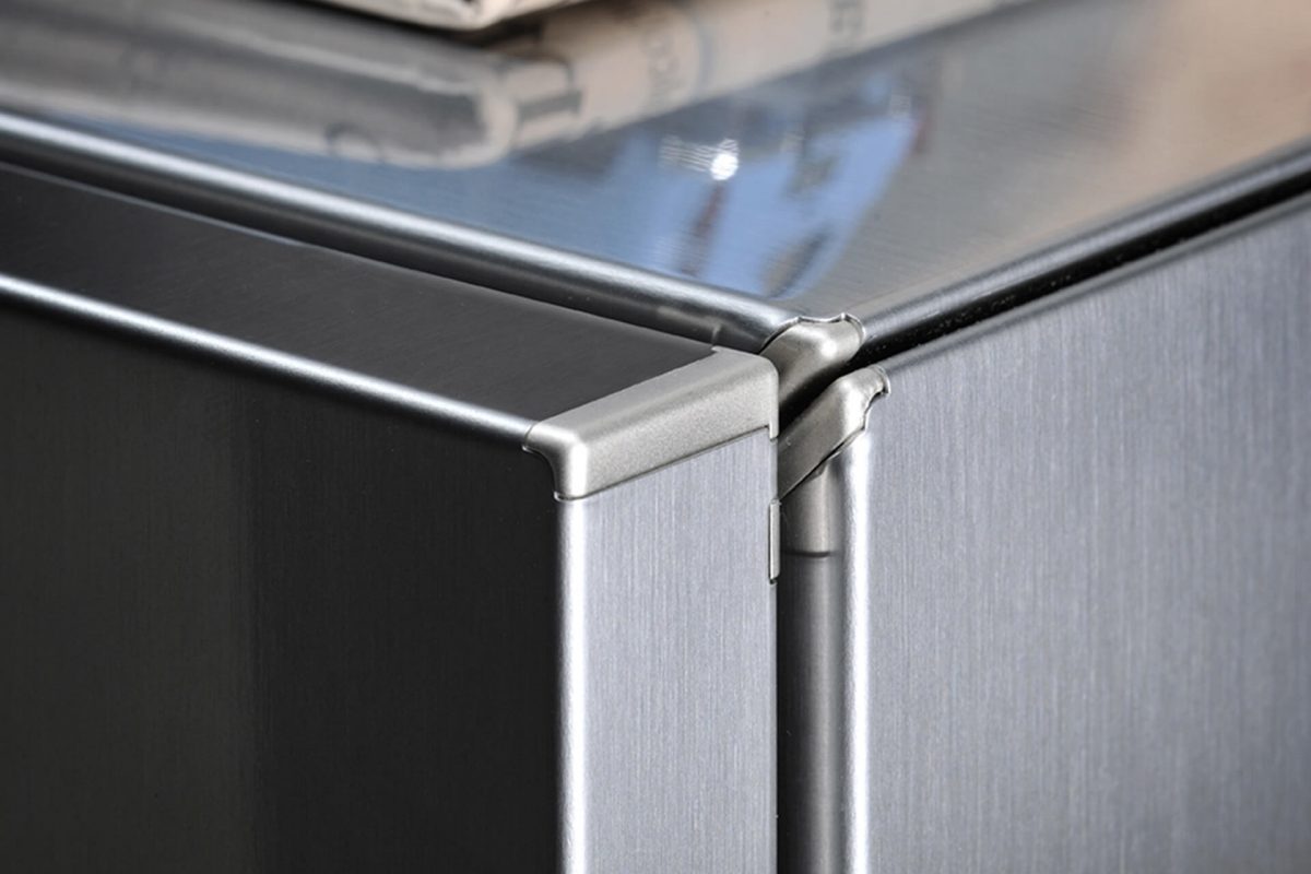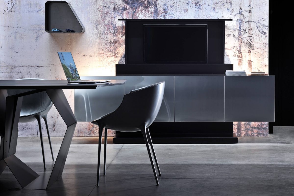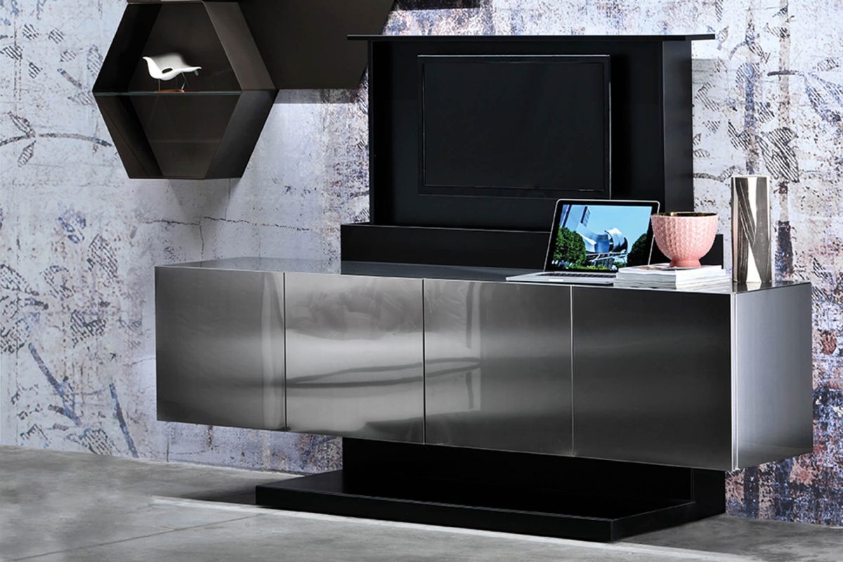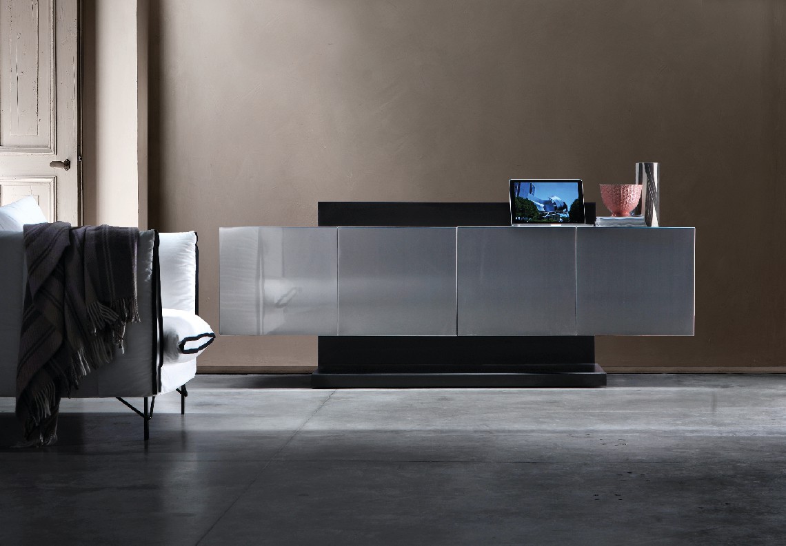 Freestanding sideboard with a metal cabinet (no-fingerprint steel or burnished finishes) and a matt laquered structure.
