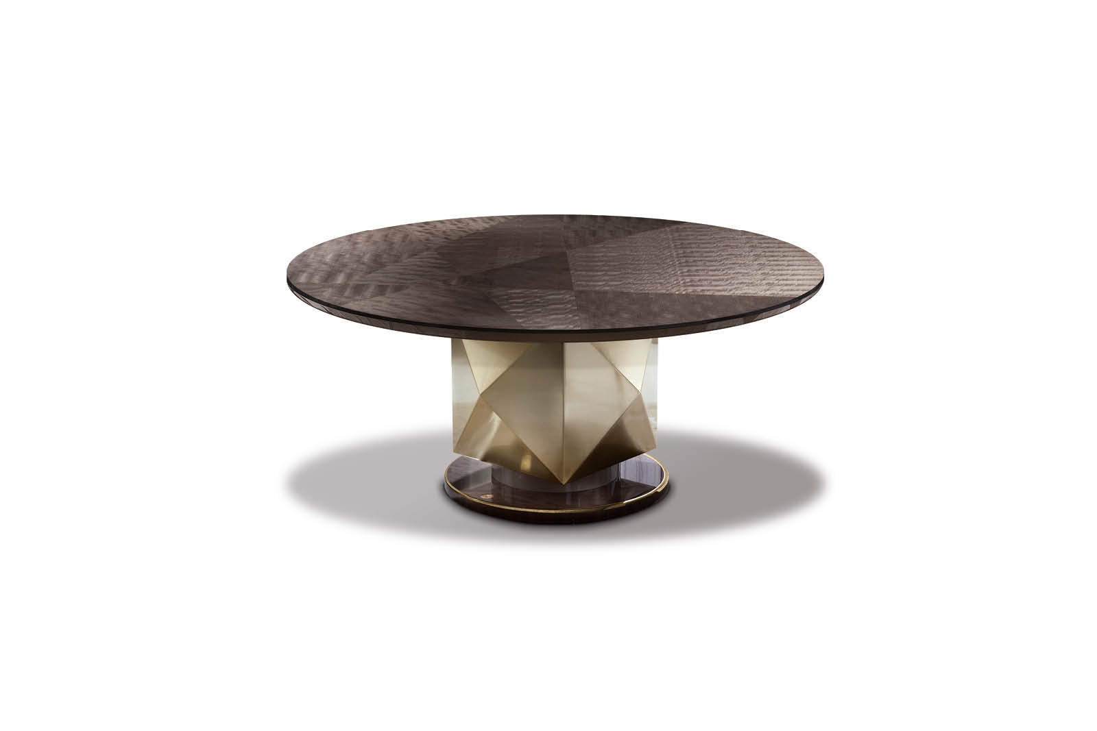 Round table in makorè mahogany veneer with high gloss polyester finish. Fixed top, metal base with Giorgio Collection logo. Inlaid veneer top. Details in light gold chrome stainless steel.