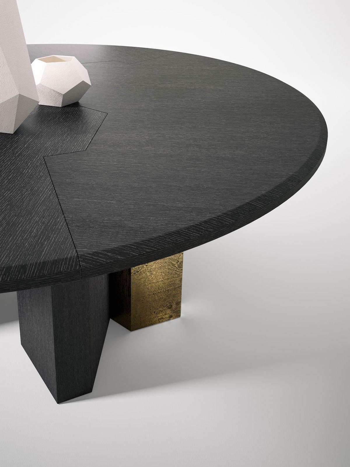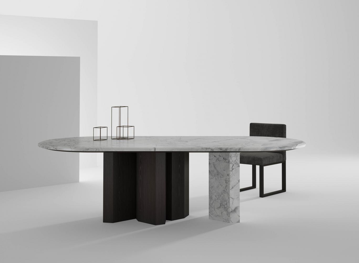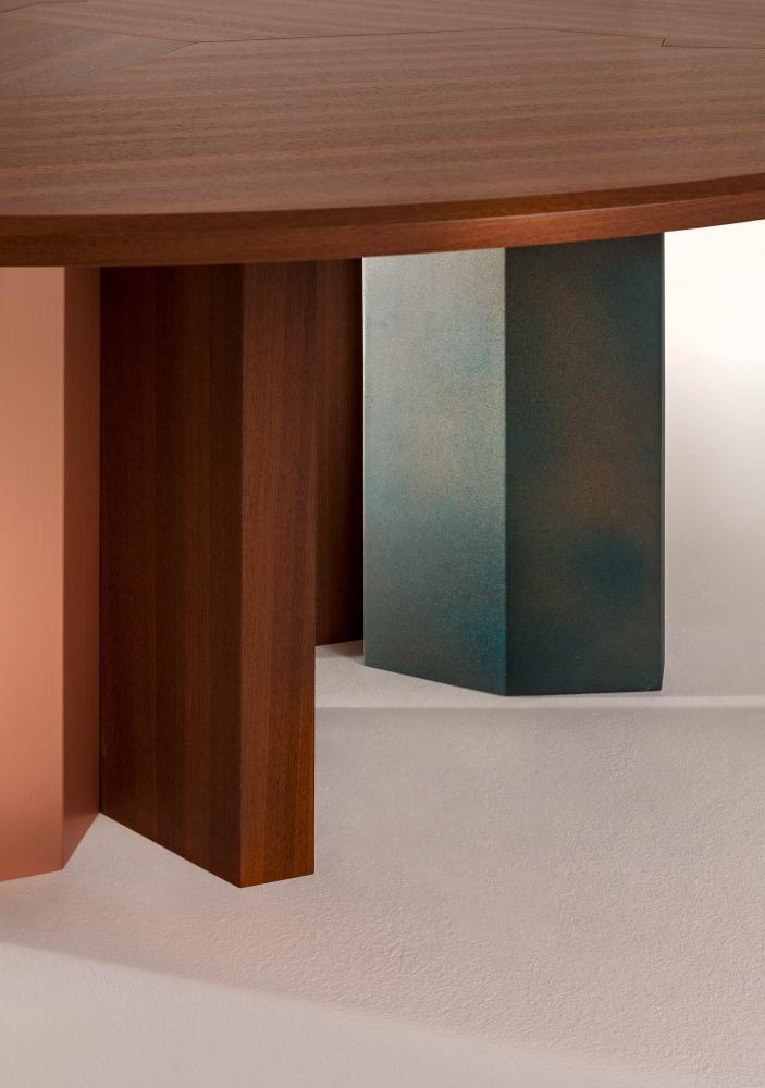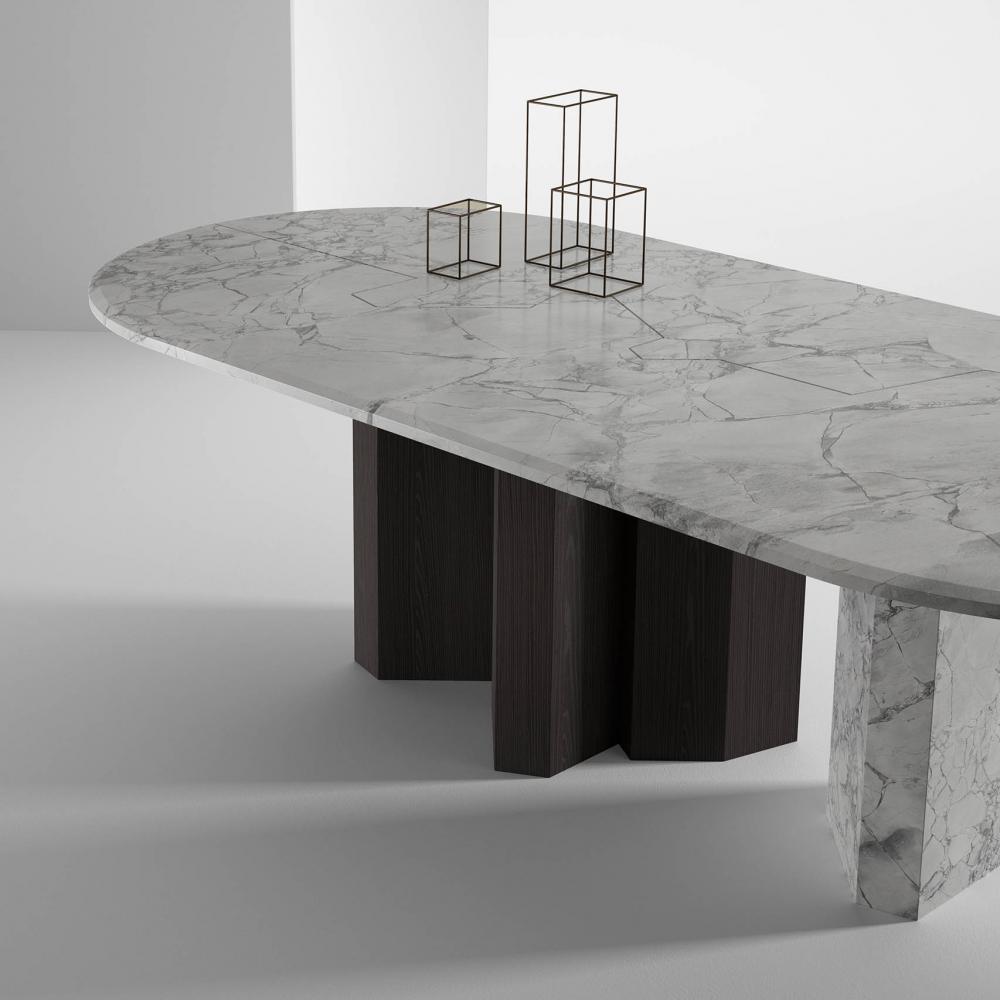 Family of tables in marble or wood, featuring important and at the same time essential shapes. Legs and top available in all the woods of the collection, natural or dyed, with "Raptor" Liquid Metal finish and in marble.
