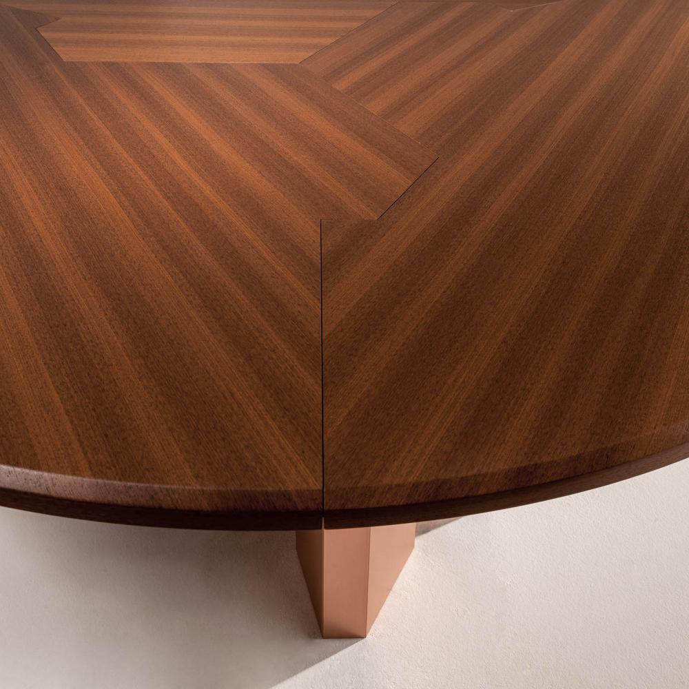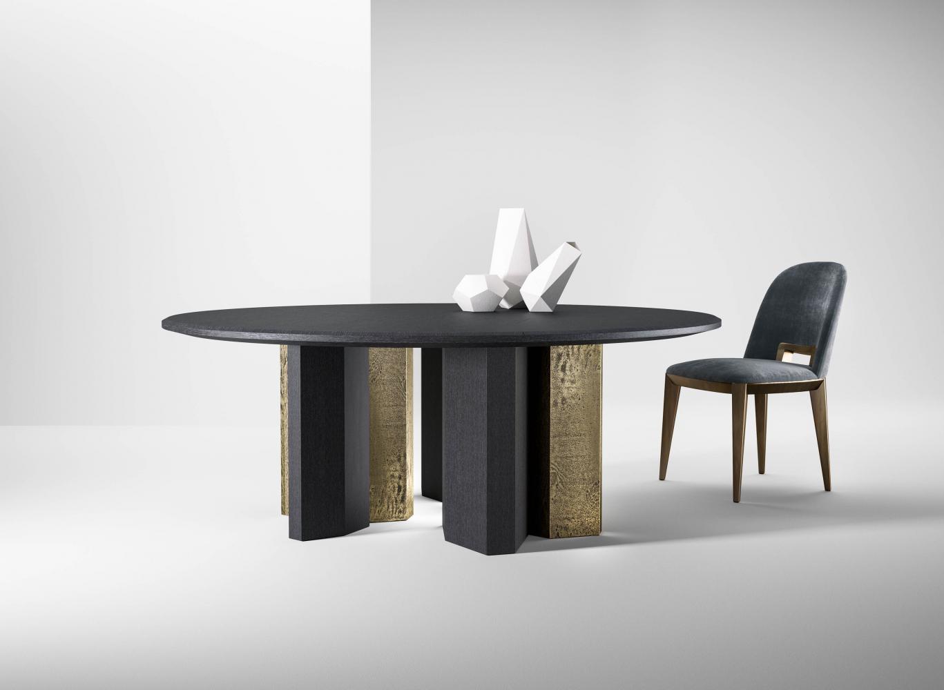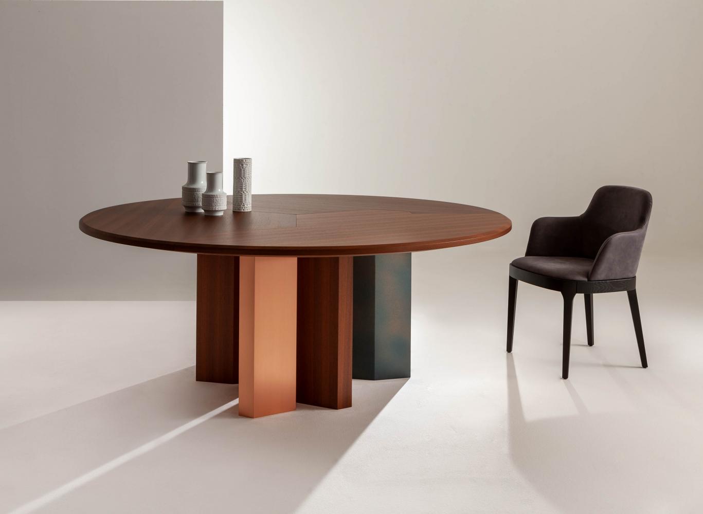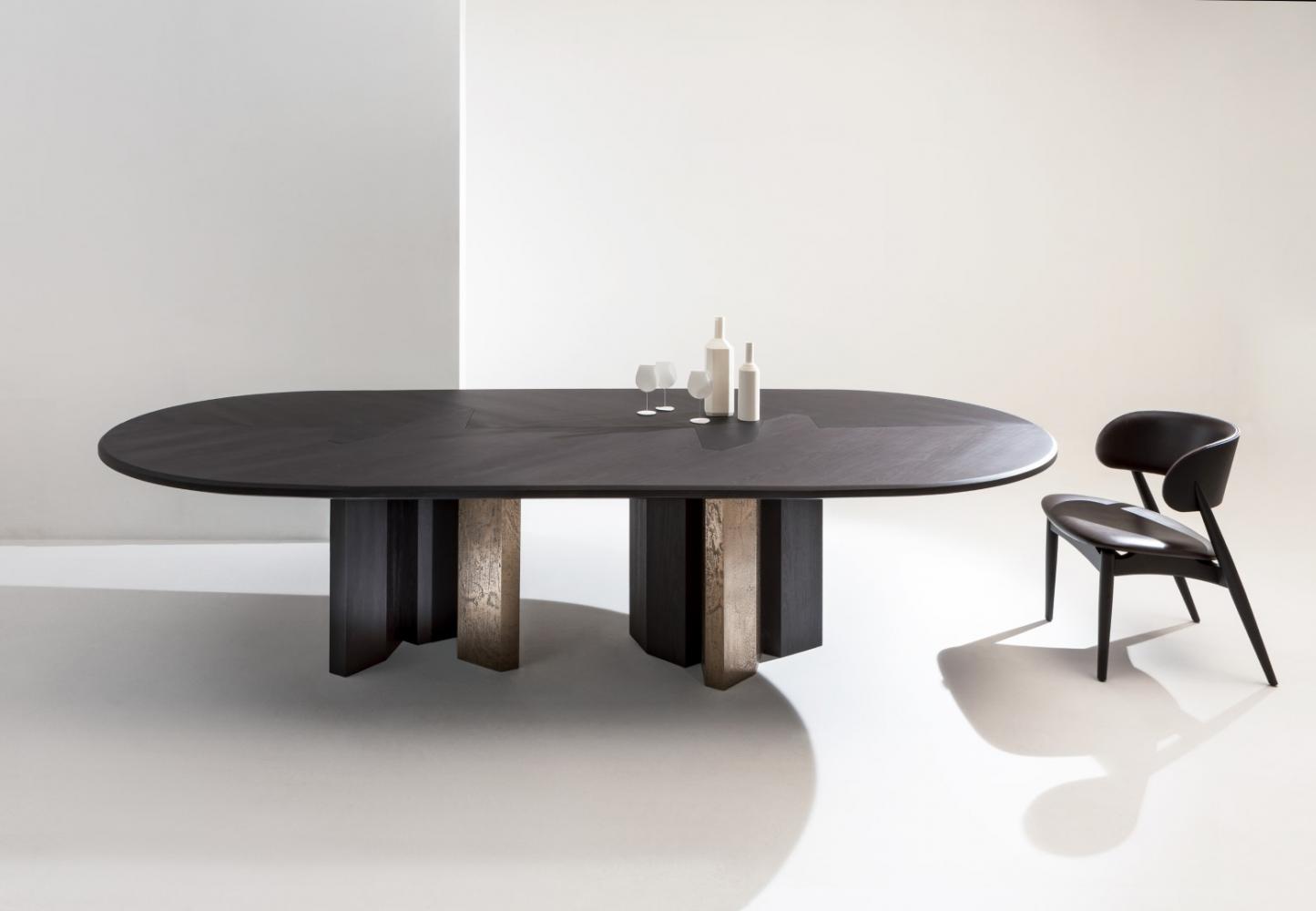 Family of tables in marble or wood, featuring important and at the same time essential shapes. Legs and top available in all the woods of the collection, natural or dyed, with "Raptor" Liquid Metal finish and in marble.
