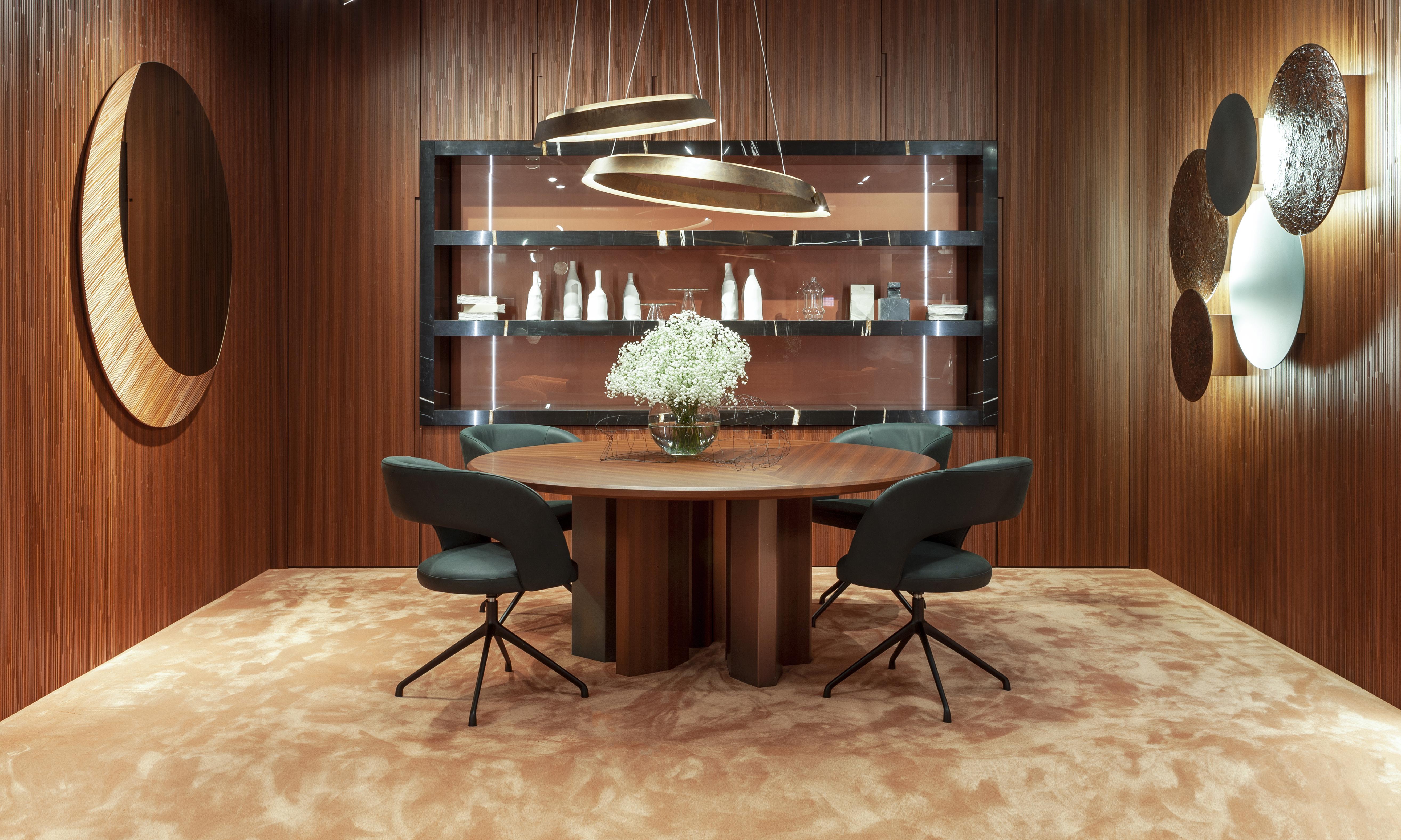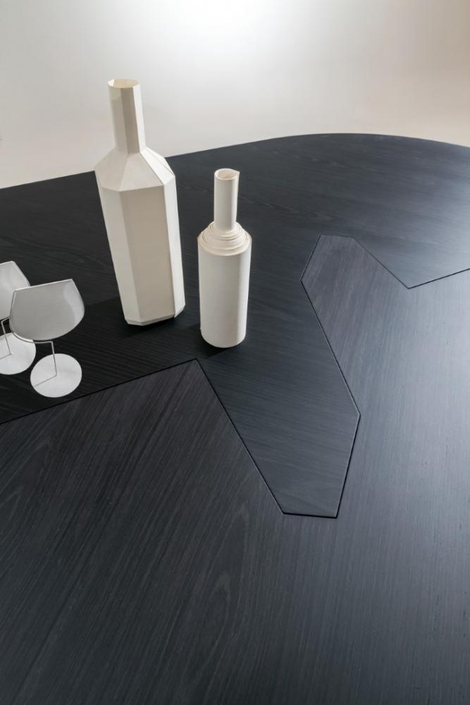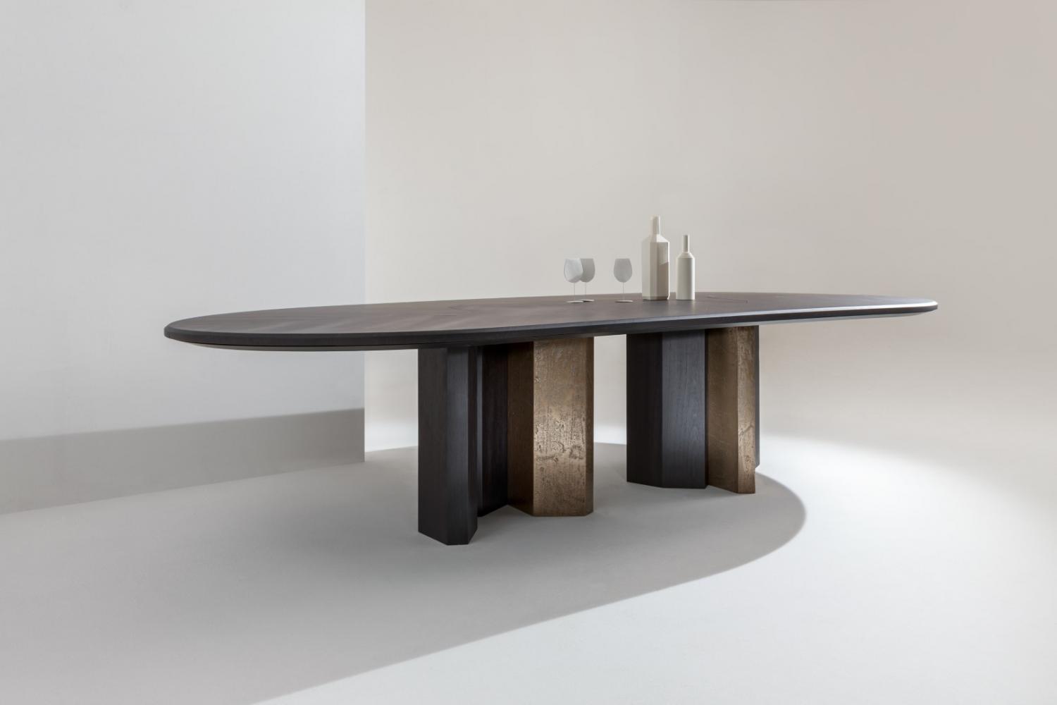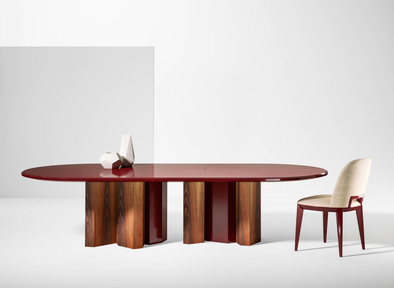 Family of tables in marble or wood, featuring important and at the same time essential shapes. Legs and top available in all the woods of the collection, natural or dyed, with "Raptor" Liquid Metal finish and in marble.