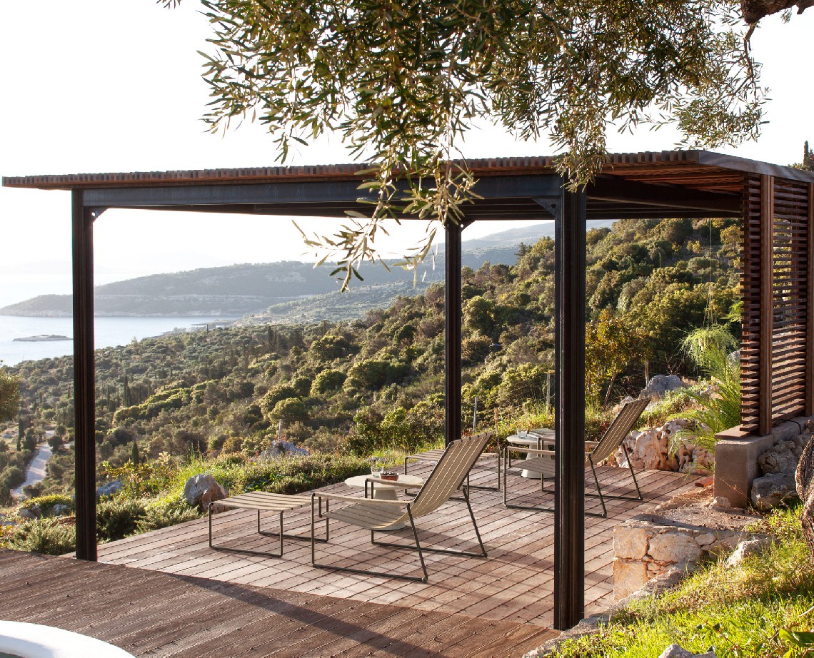 The new and highly original Strappy line features a coated stainless steel structure consisting of one continuous rod running all the way around to form a minimalistic yet functional and stackable framework, to which the padded seat straps and armrests are attached. They appear as if suspended inside this elegant frame. That the front and rear are connected only by soft elements is, however, an optical illusion. What meets the eye is in fact the upholstery, the aluminium straps are nicely hidden inside. Together with the hidden armrest connection they are the backbone of the Strappy. This optical ‘trick’ not only makes it possible to have a very fine and fragile looking framework, but also caters for an even bigger advantage. The upholstery can be removed in no time, for cleaning or winter storage. With an extra set you could even change the look of the Strappy to follow the colours of the season. As if the selection of some 70 different colours and textures for the upholstery fabrics wasn’t enough, we have also added three highly resistant imitation leathers to the list. Dressed in black, cognac, or taupe leather-look fabric, Strappy really stands out from the crowd and blurs the line between indoor and outdoor furniture.