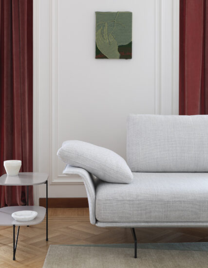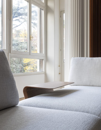 Flow, adapt, create void, rearrange space, receive and renew indefinitely. The new Avant-Après seating is able to do it all. Rigid yet lightweight, the sofa comes in fascinating configurations thanks to the special and unique armrest/backrest system that detaches with a simple movement and may be positioned all along the base. A pre-and-post dance that can be staged every day, created by the desire to try something new. Avant-Après has a sober allure and an elegant appearance. The seating is placed on a metal base upholstered in fabric or leather, resting on metal feet. Refined accessories complete the system: the side tables are walnut wood and come in two different sizes, with the warm notes of the wood. Fully removable covers.