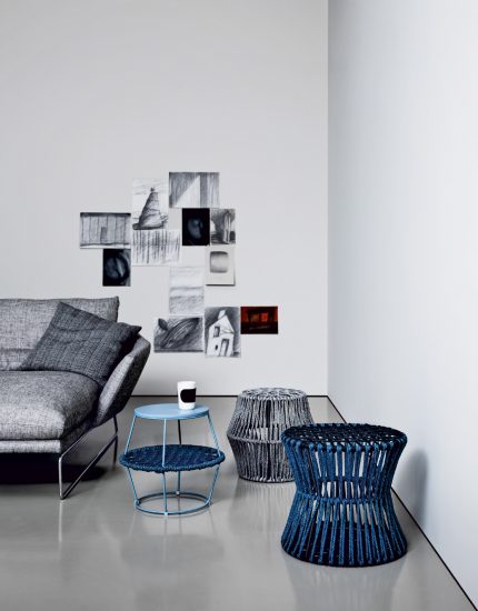 Metal, wood, rope: simple materials which reinvent commonly used objects. A collection of poufs and coffee tables made in metal rods and woven nautical cords, mixed together like the paints on an artist’s palette. The reference to David Bowie’s iconic Ziggy Stardust is no accident and relates to the irony in the idea of revolutionising the type of accessory furniture in the area for relaxing. The barrel and hourglass silhouettes come together to make up islands which expand: interweaving and volumes are enhanced in the coordination of the mixed colours of the cord, pointing to a new idea of furnishing accessory with endless possibilities of personalising the space. The two-tone plaited rope is an exclusive Saba combination.