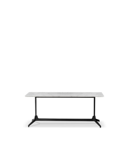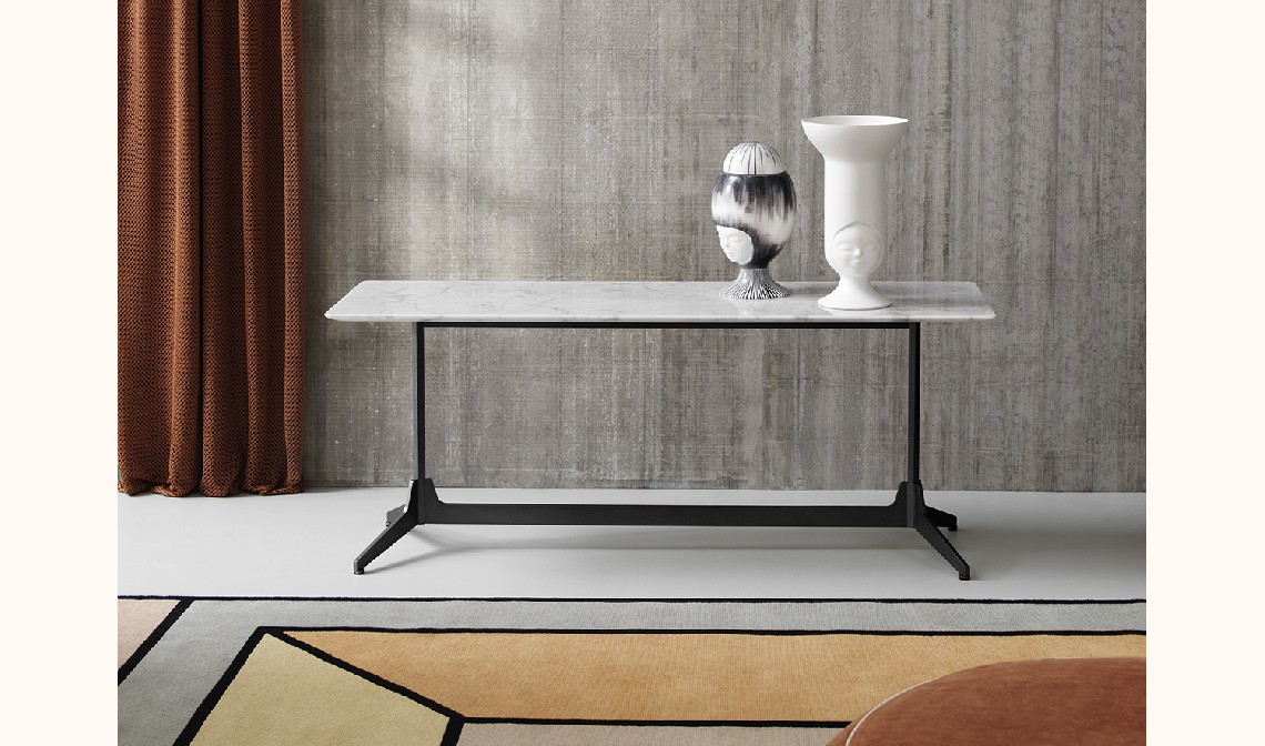 The project takes its inspiration from the concept of our memory, reimagining simple and iconic forms with echoes from the past. Central to the design is the upright hexagonal structure typically used in building construction that, in this particular context, is interpreted as a joint onto which the feet are attached perpendicularly. This style detail is reminiscent of 1950’s furniture design. The base of the table is painted finished metallic wire drawn and the top in marble.
